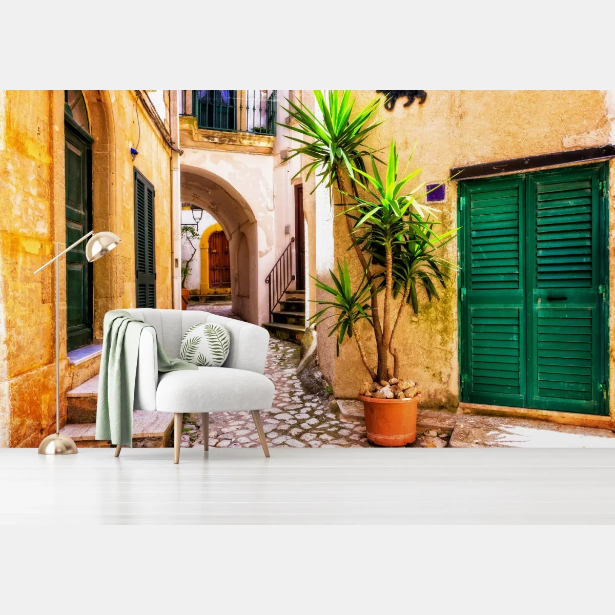 Fototapete Sonnige mediterrane gasse mit grünen jalousien
