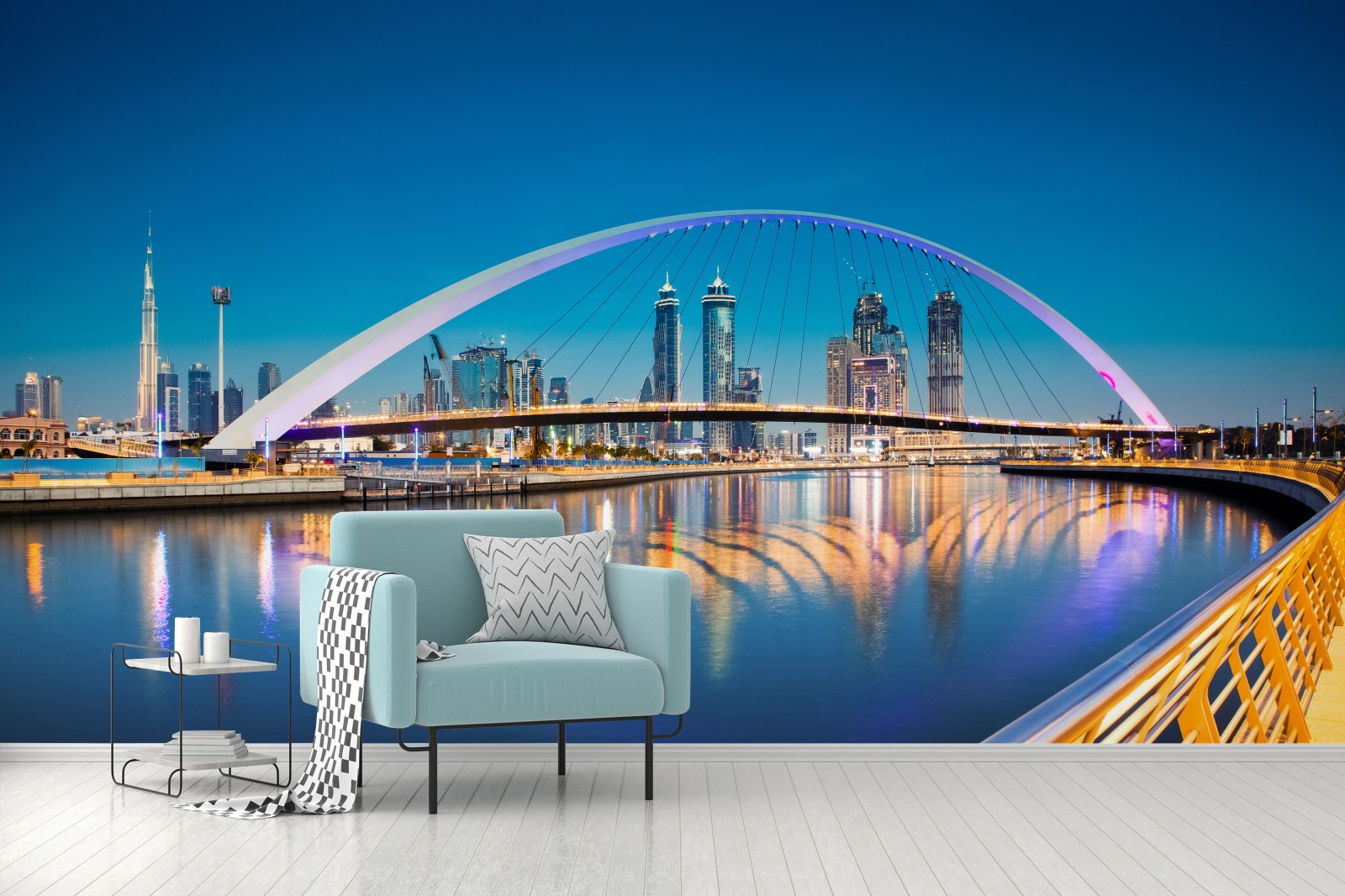 - sonnenuntergang, moderne architektur, lichter, dubai, spiegelung, brücke, stadtsilhouette, nachtaufnahme, burj khalifa, wasserkanal