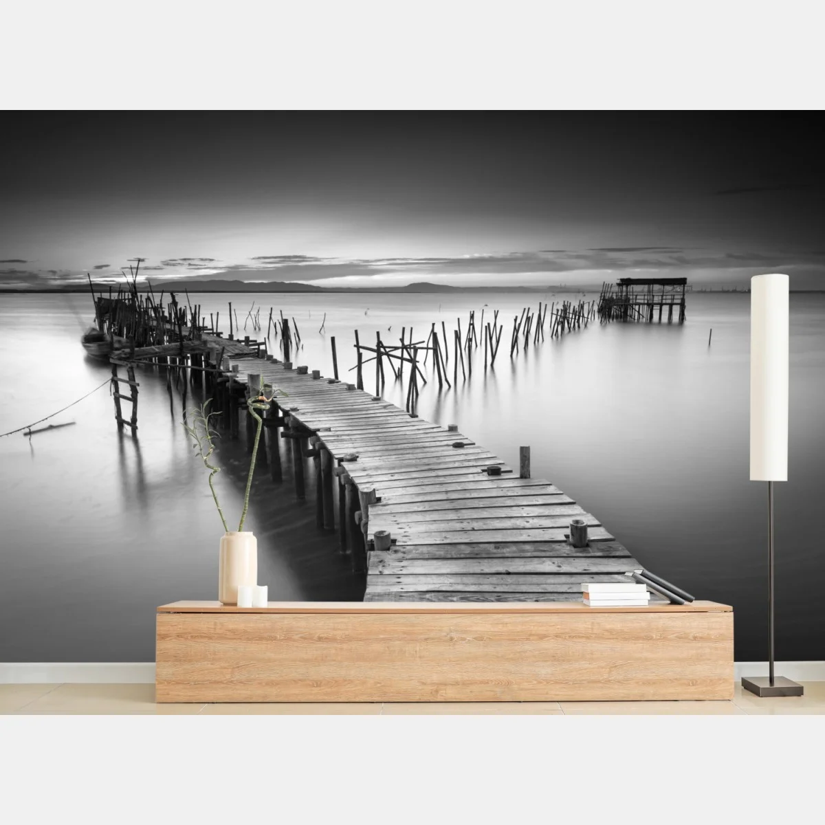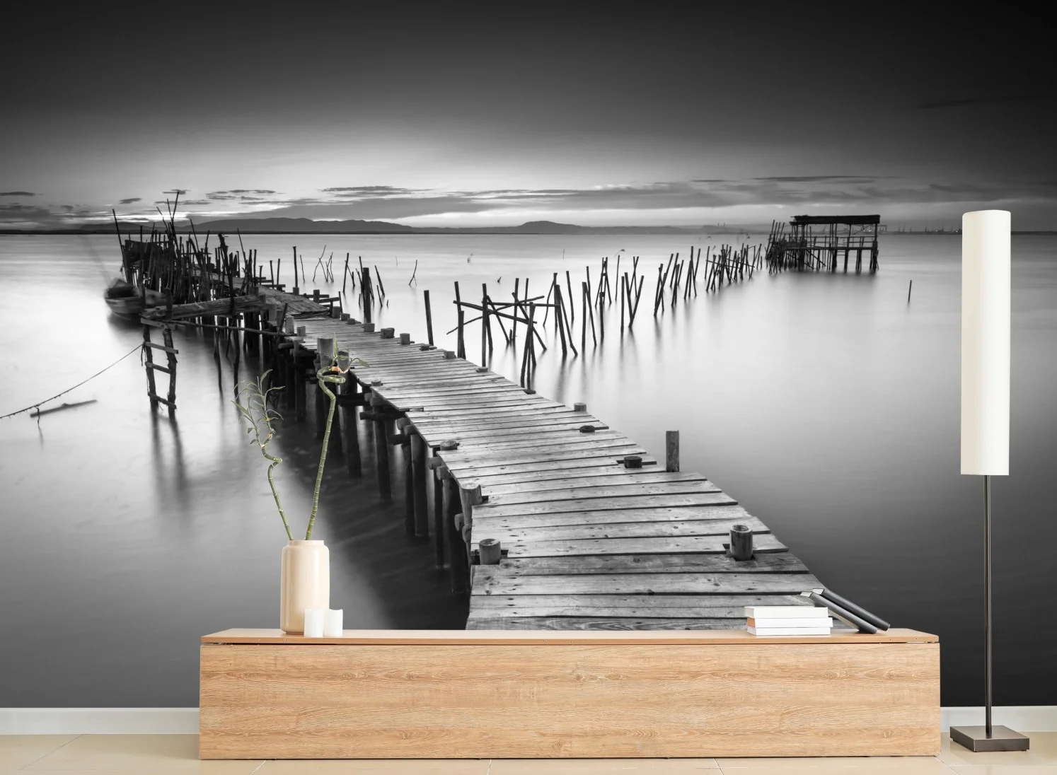 Fototapete Ruhiger hölzerner steg bei dämmerung