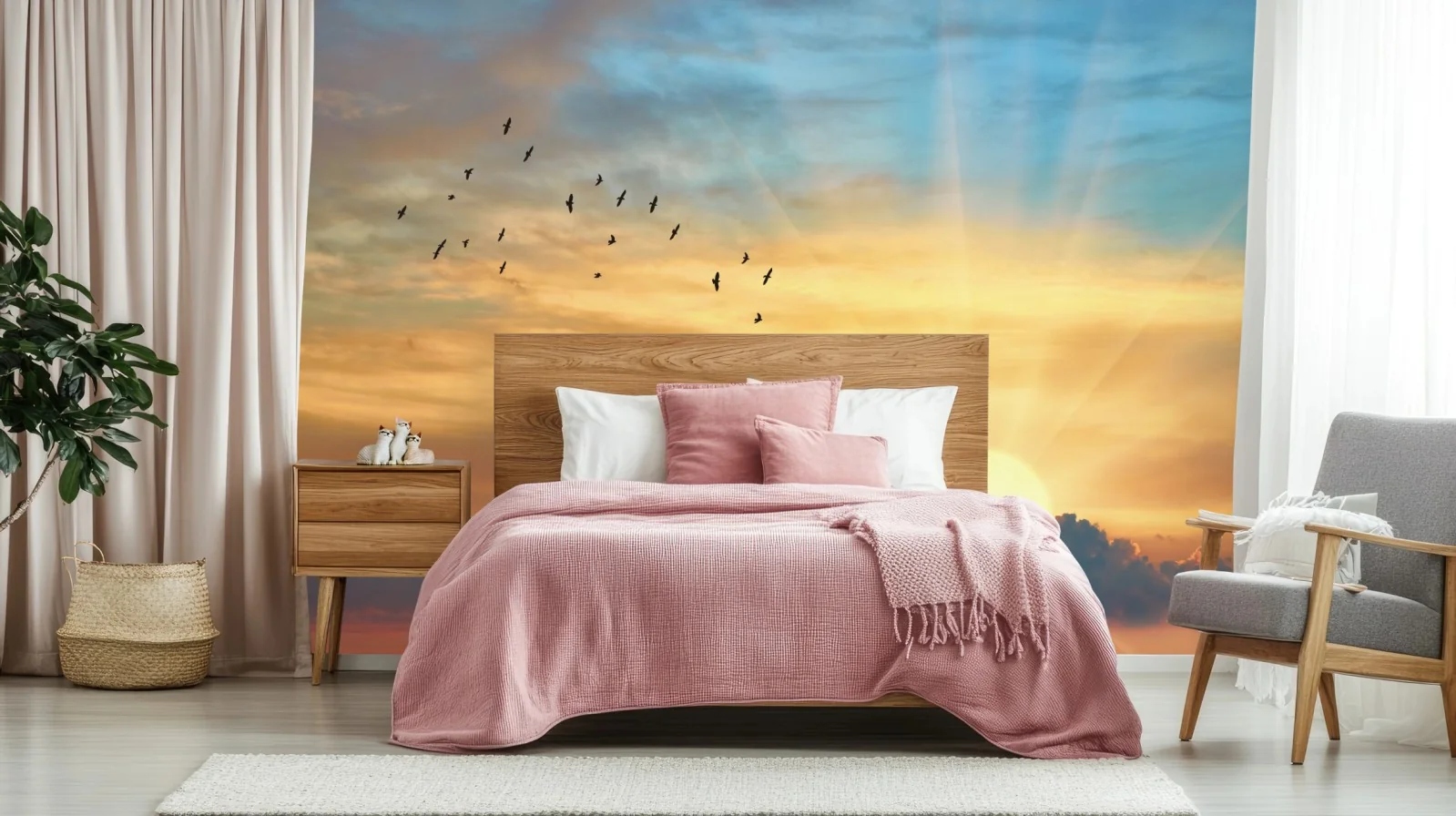Erleben Sie friedliche Morgen mit einem goldenen Sonnenaufgang, der warme Strahlen durch dramatische Wolken und fliegende Vögel wirft.MehrWeniger