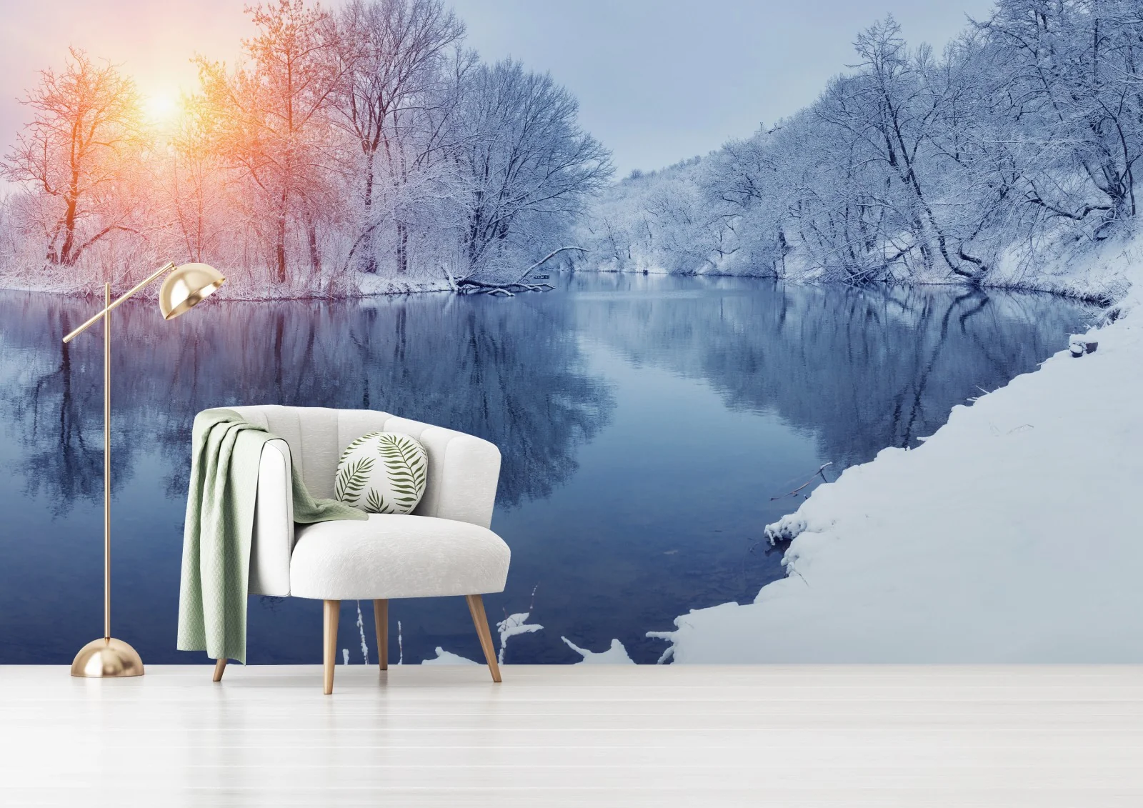 Fototapete Winterliche flusslandschaft bei sonnenuntergang