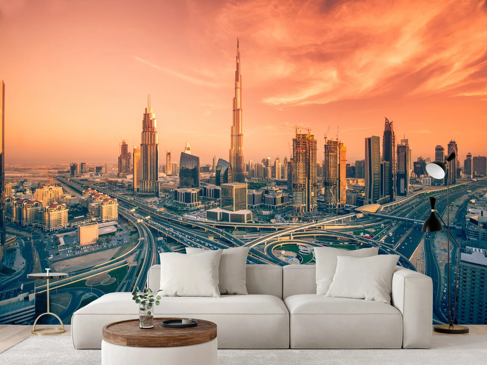 - modern, stadtbild, sonnenuntergang, wolkenkratzer, stadt, skyline, urban, dubai, architektur, autobahn