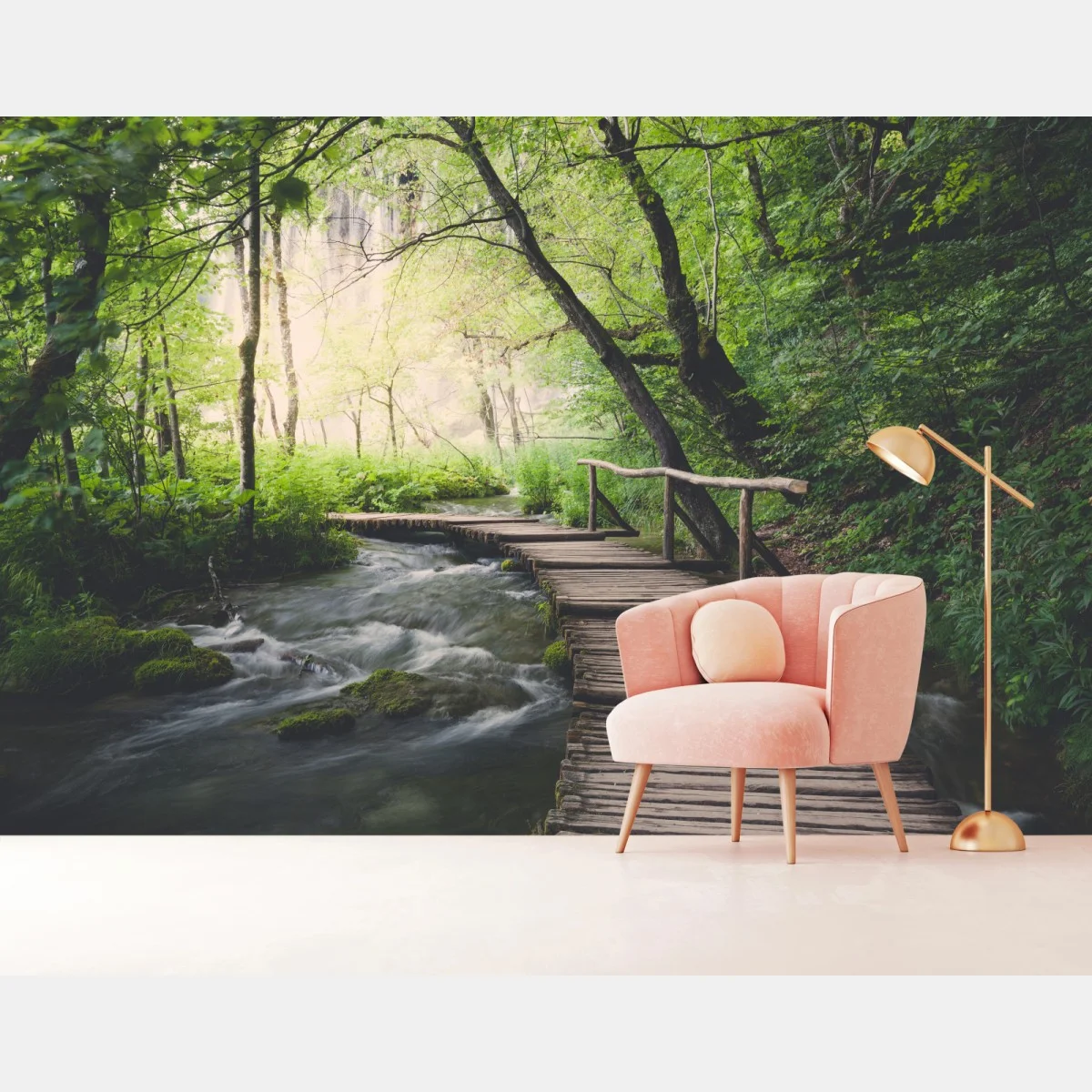 Bringen Sie die beruhigende Atmosphäre eines Flussufers mit dieser Szene eines hölzernen Stegs im grünen Wald in Ihren Raum.MehrWeniger