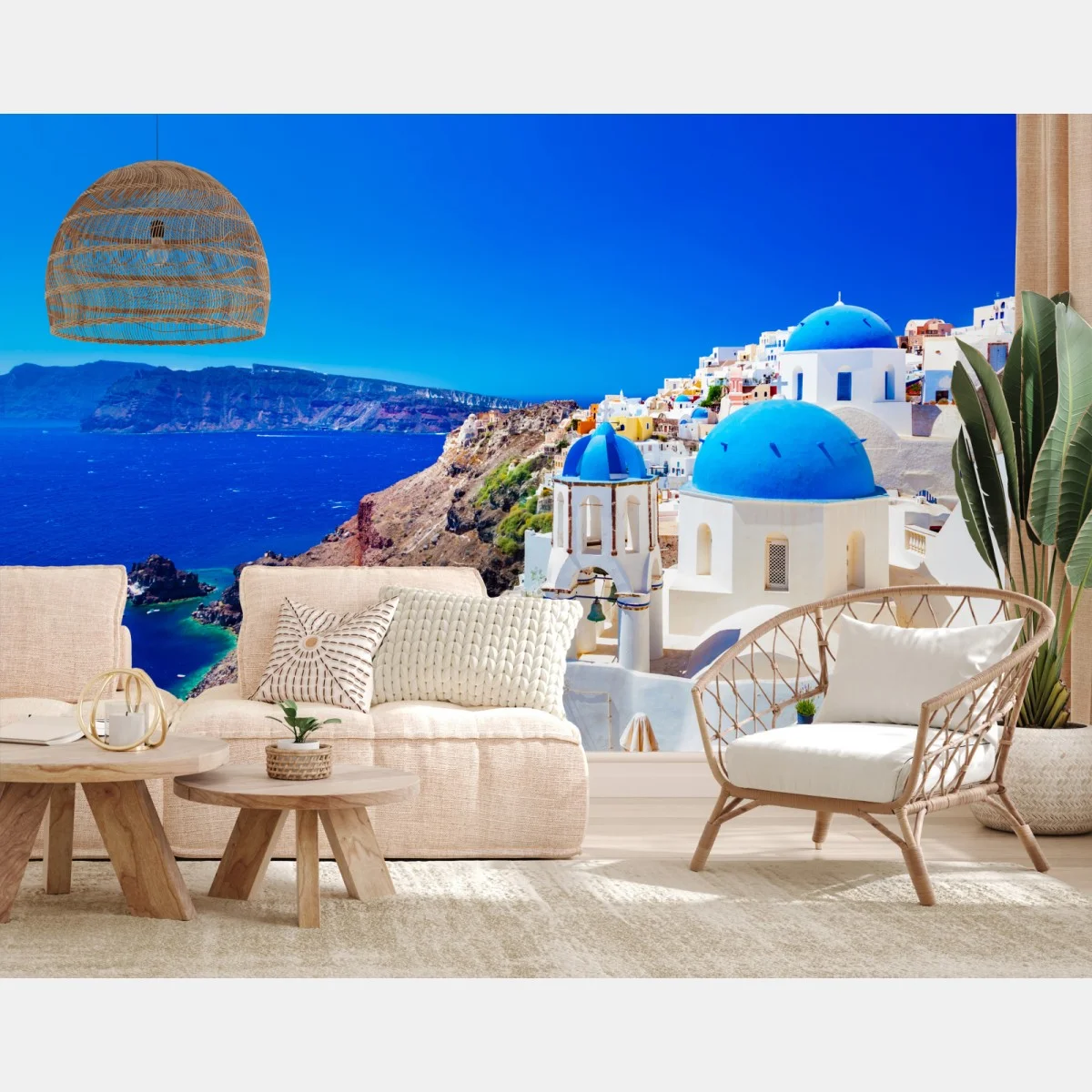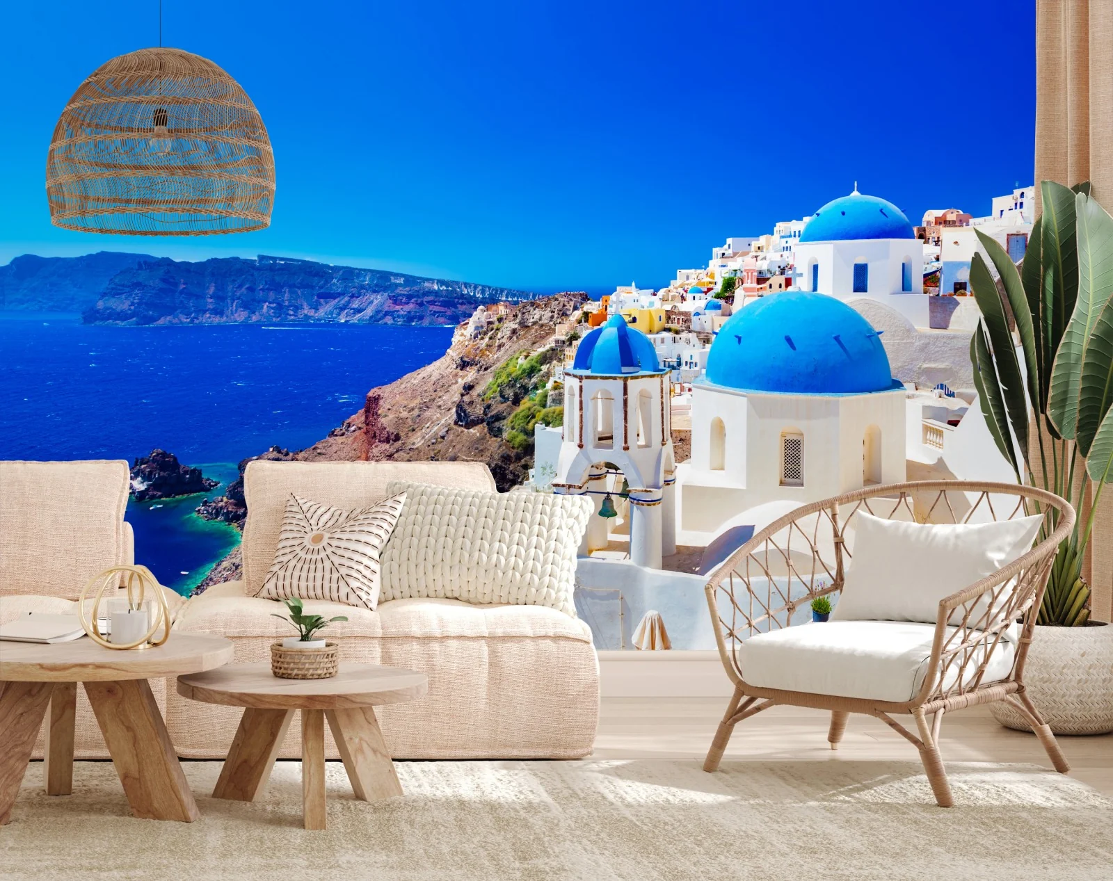 Fototapete Santorini blaue kuppeln über dem Ägäischen Meer