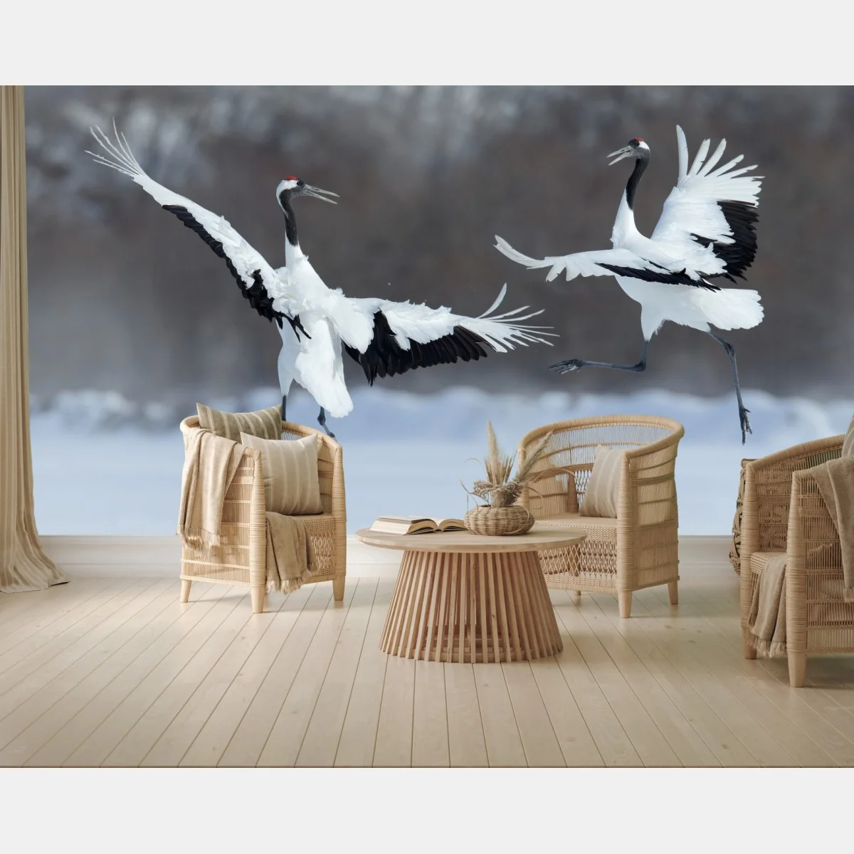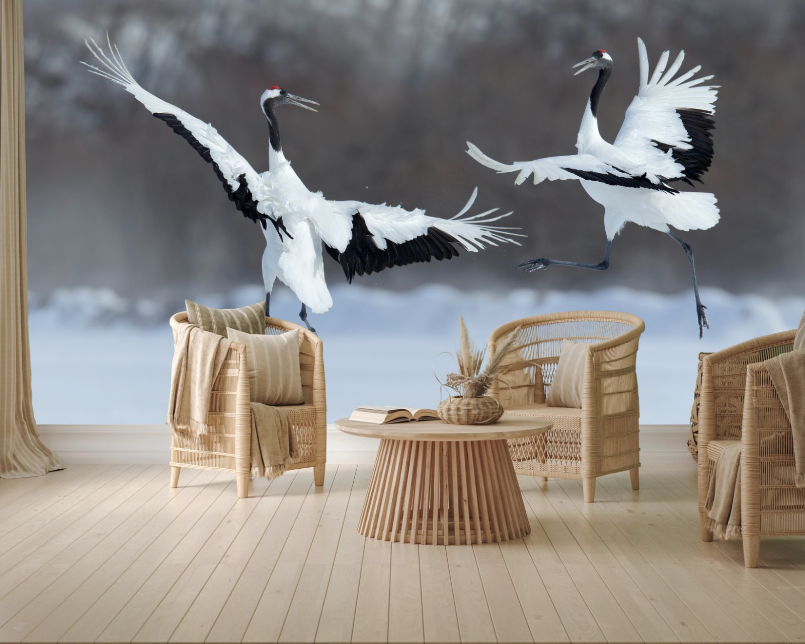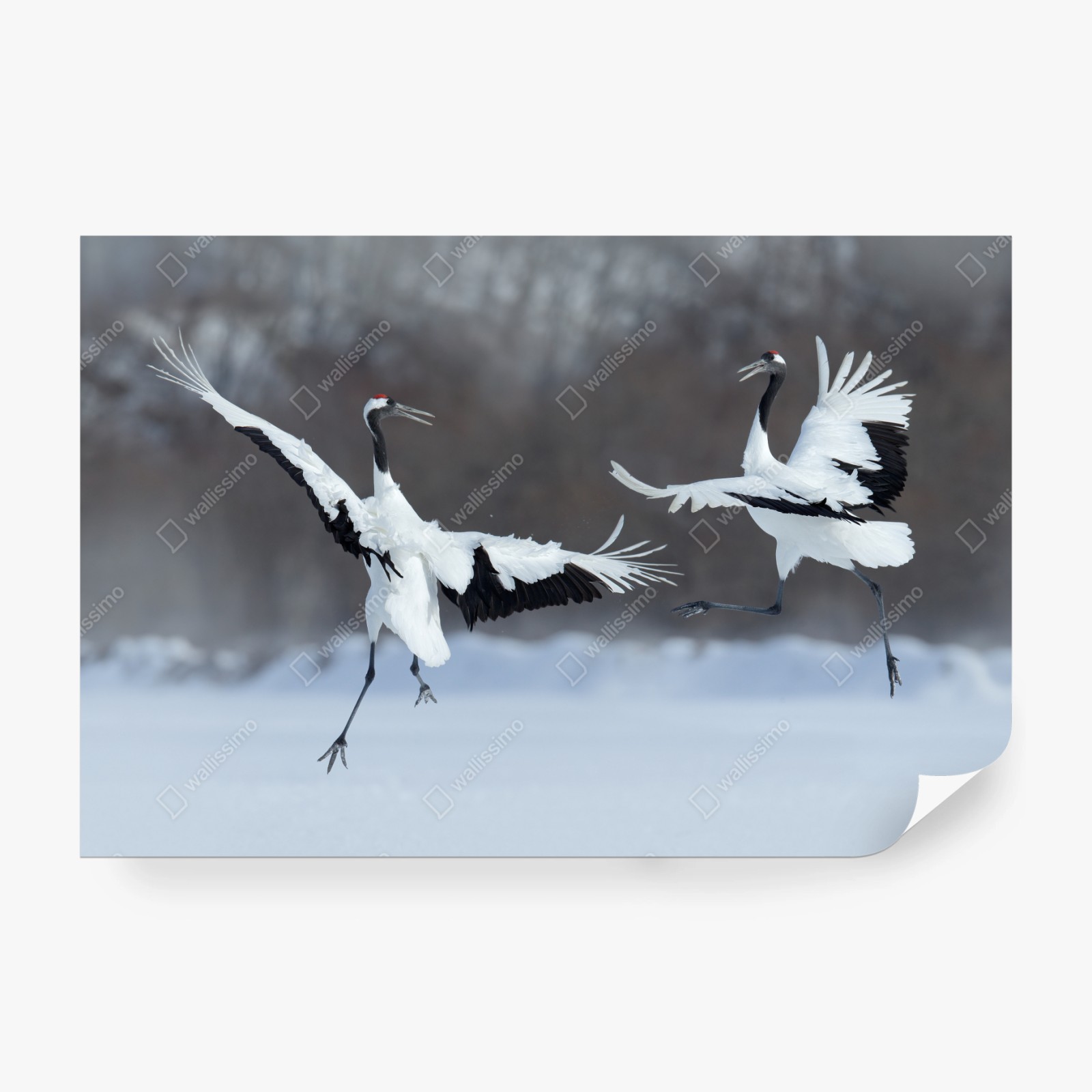 Fototapete Tanzende rotkronenkraniche im schnee, Hokkaido