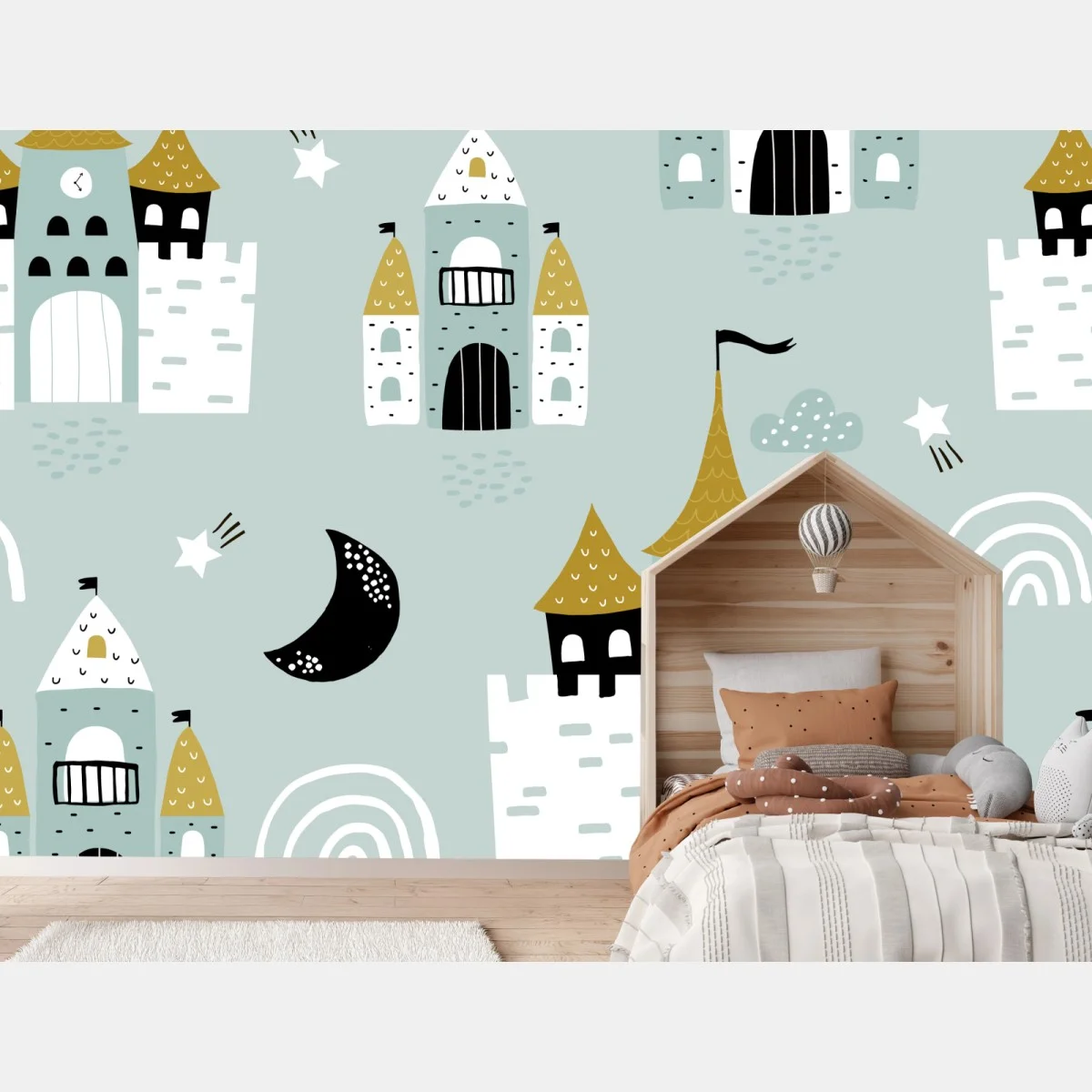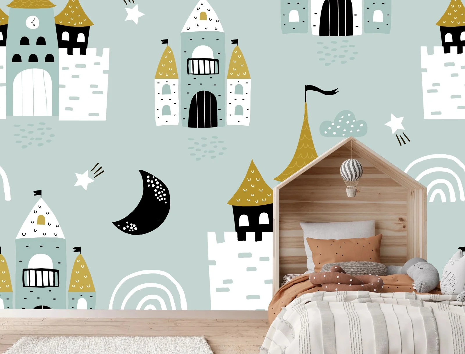 - kinder, sterne, burg, muster, tapete, regenbogen, mond, prinzessin, märchen, zimmer