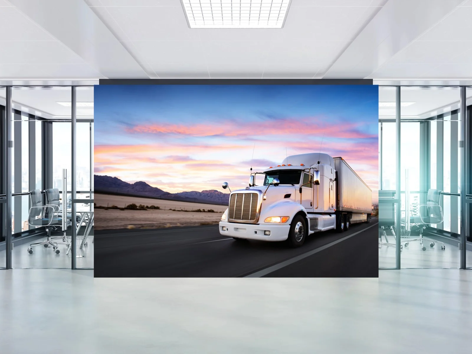 Fototapete Lastwagen bei sonnenuntergang auf der autobahn