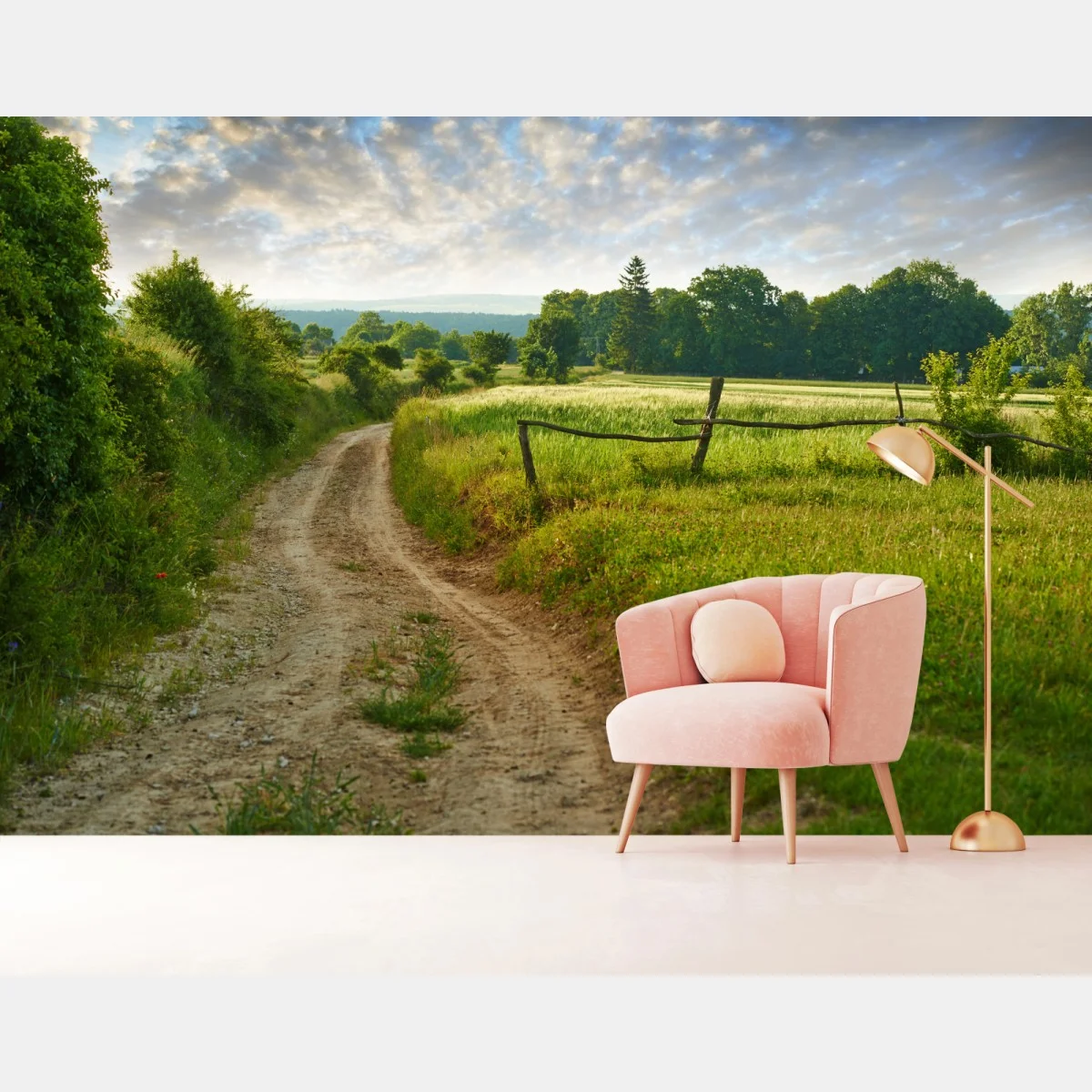 Fototapete Sonniger landweg durch grüne wiesen