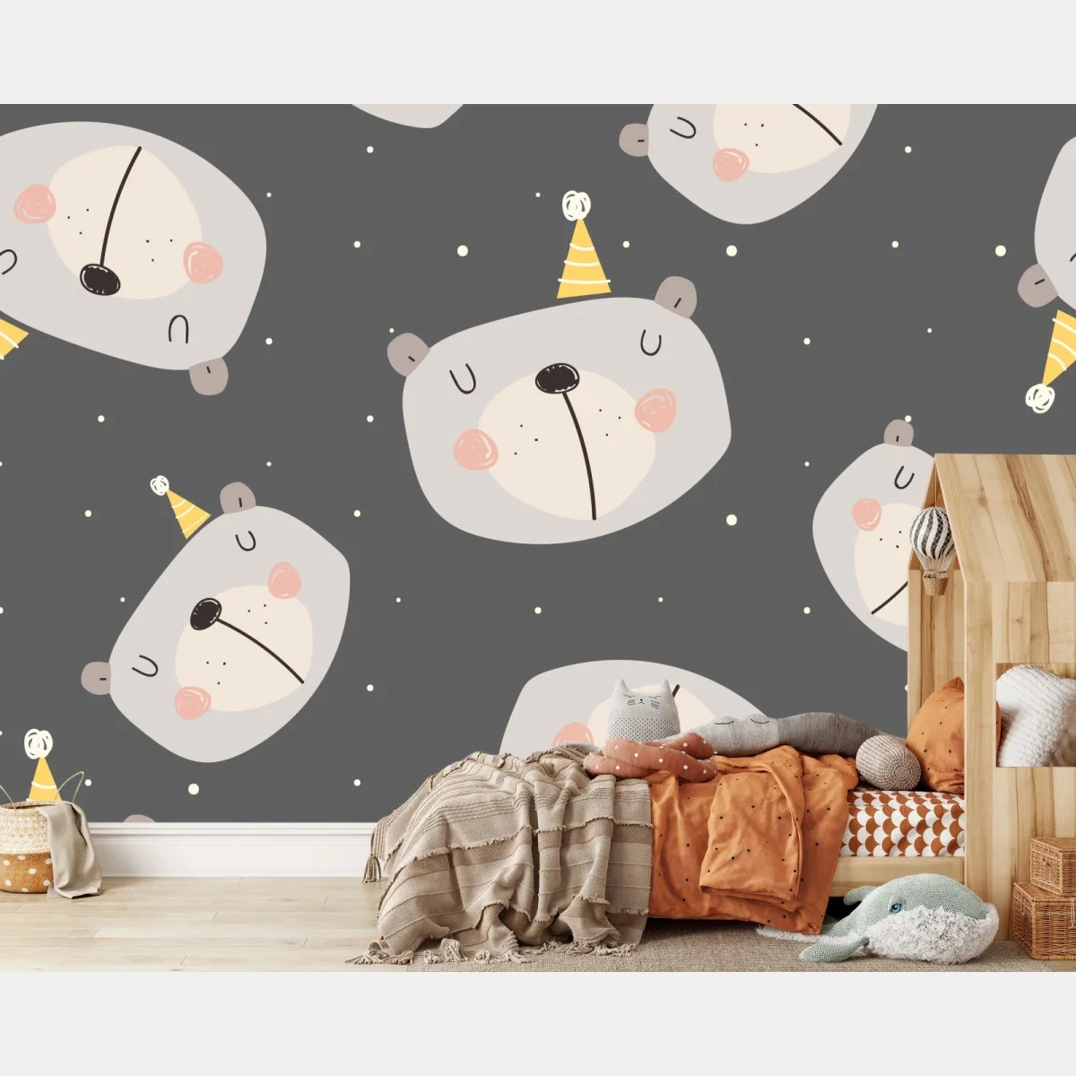 - tiere, illustration, kinderzimmer, nahtloses muster, pastellfarben, wiederholungsmuster, niedlicher bär, schlafender bär, partyhut, kinder-tapete