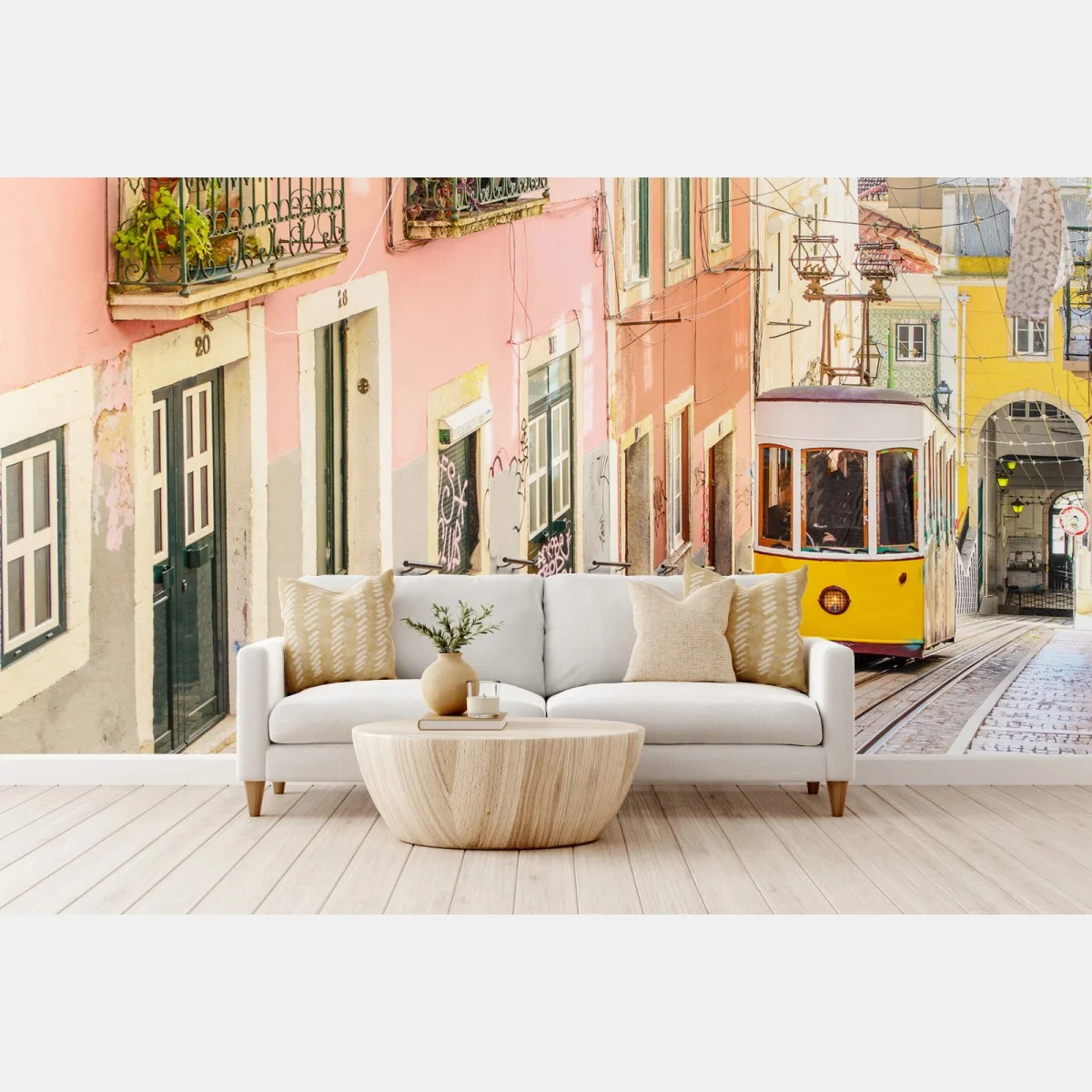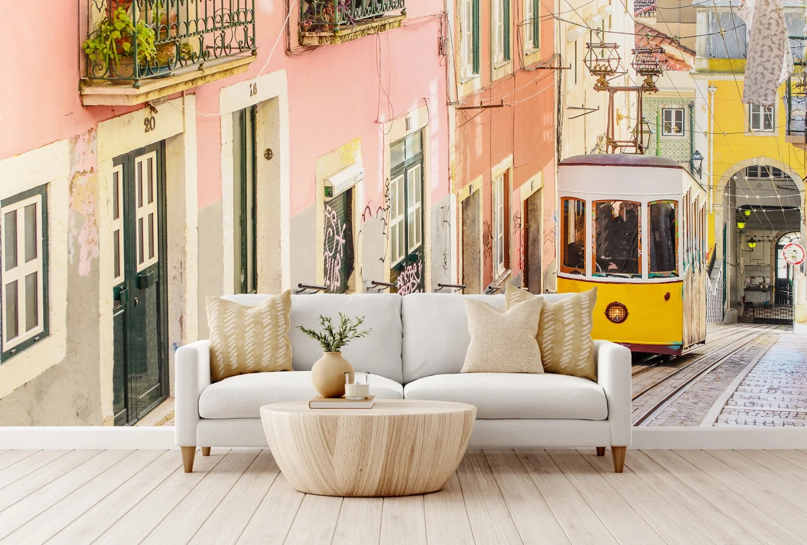 Fototapete Sonnige Lissabon straßenbahn in pastellfarben