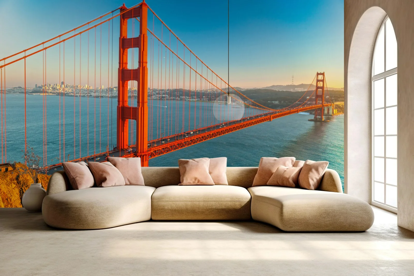 - reisen, sonnenuntergang, skyline, panorama, brücke, bucht, wahrzeichen, golden gate, san francisco, hängebrücke
