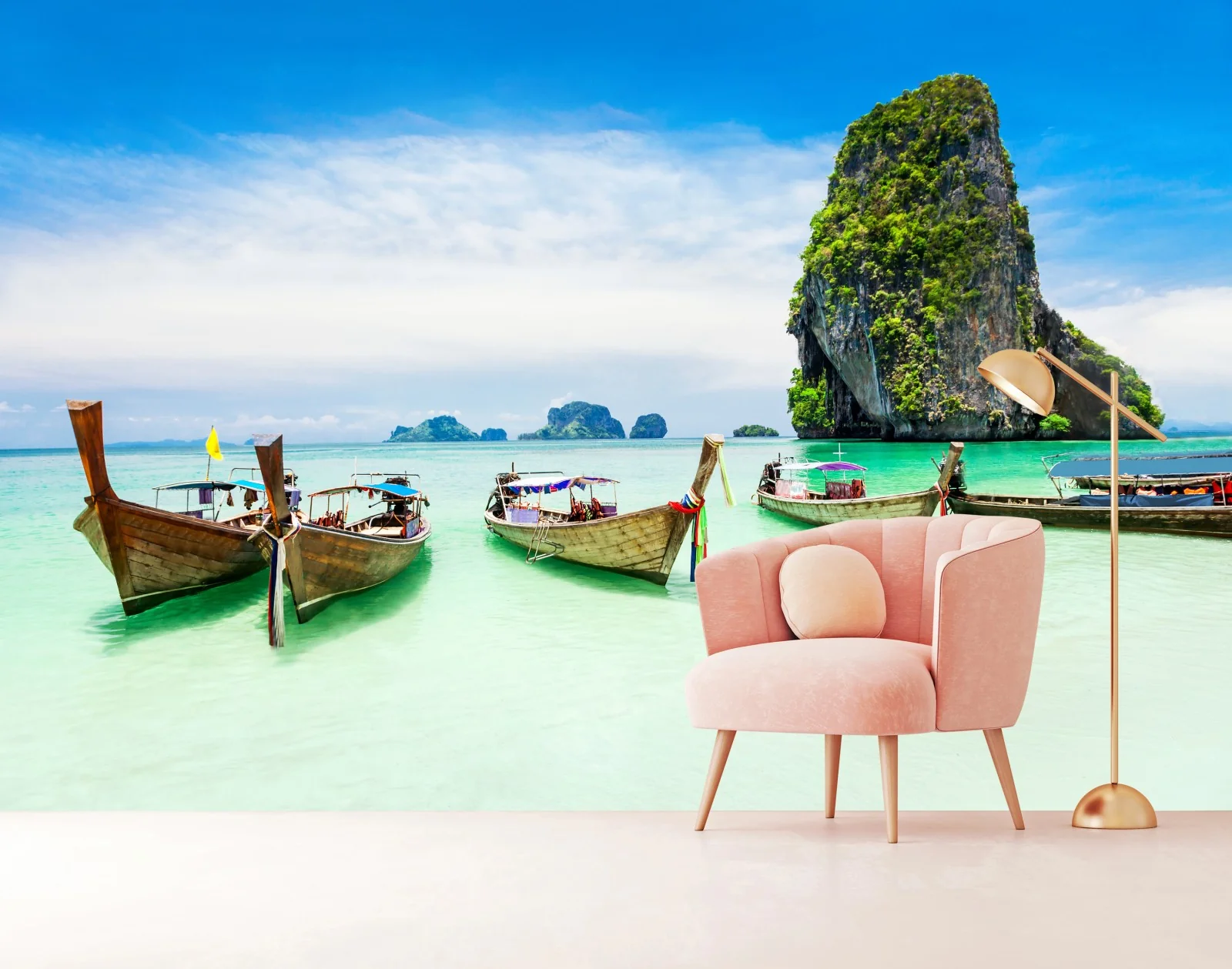 Fototapete Tropische longtail-boote am türkisfarbenen strand