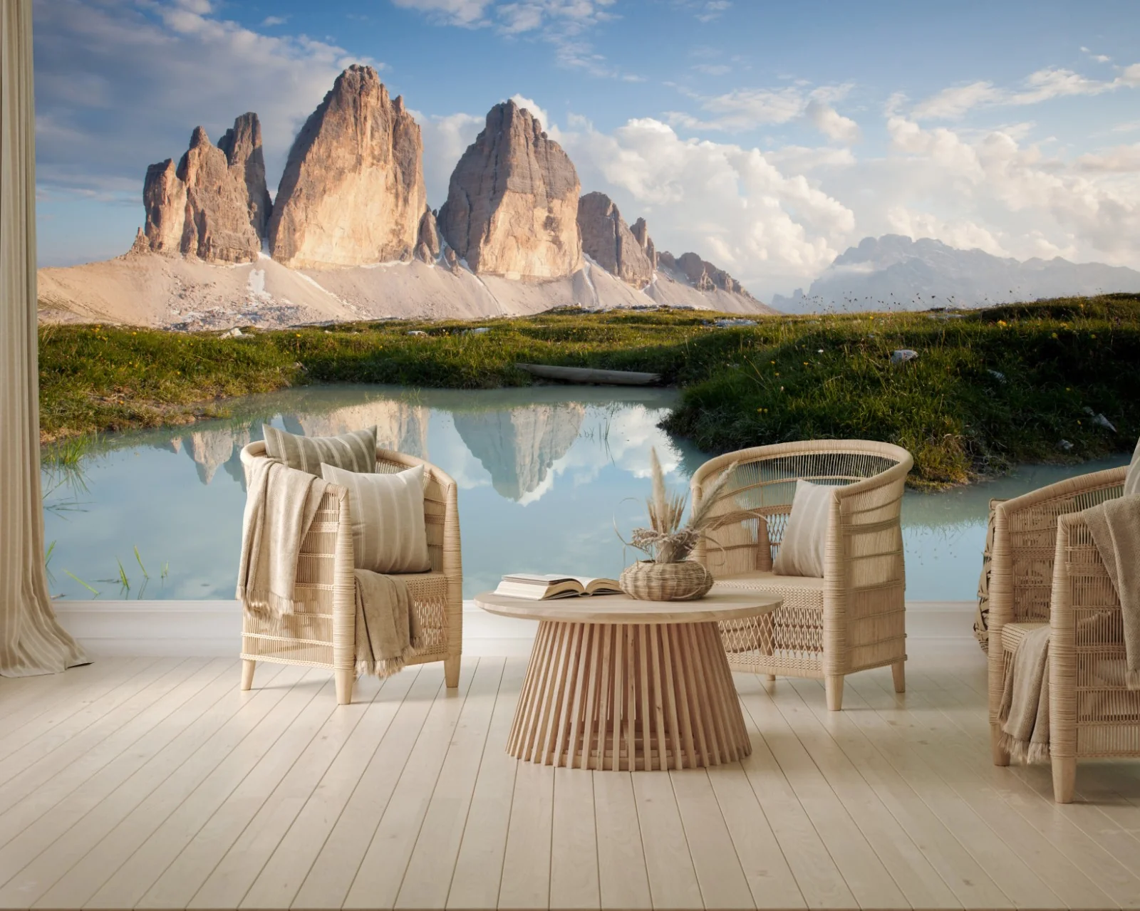 Fototapete Sonnenbeschienene alpengipfel im spiegel des ruhigen sees