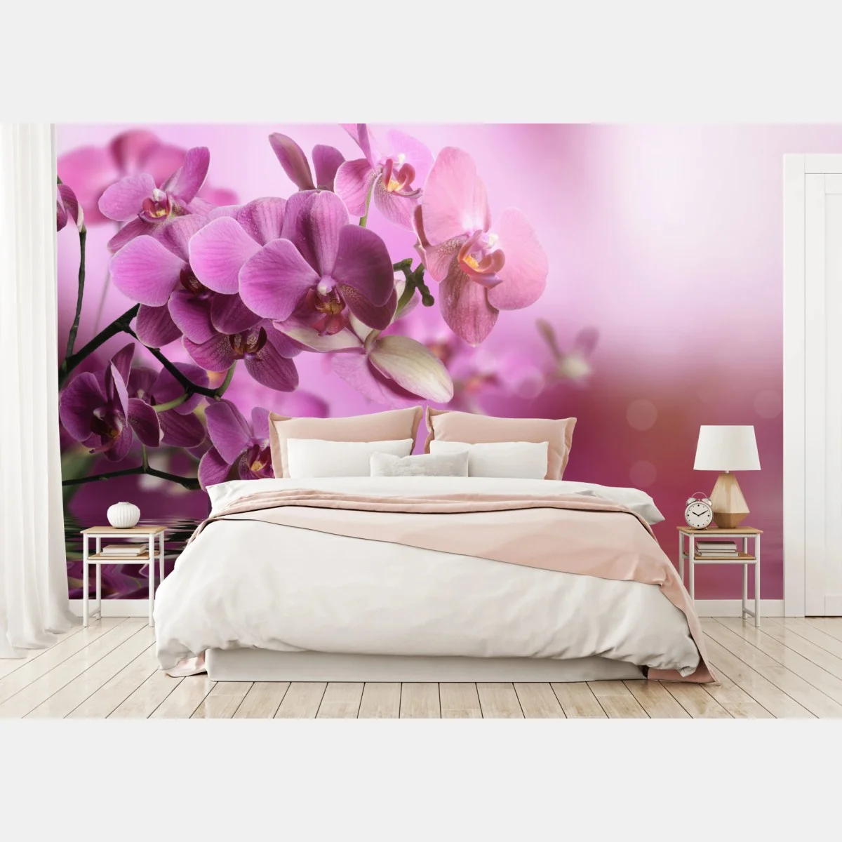 Bringen Sie sanfte Eleganz in Ihr Zuhause mit zarten rosa Orchideen und Wasserreflektionen.MehrWeniger
