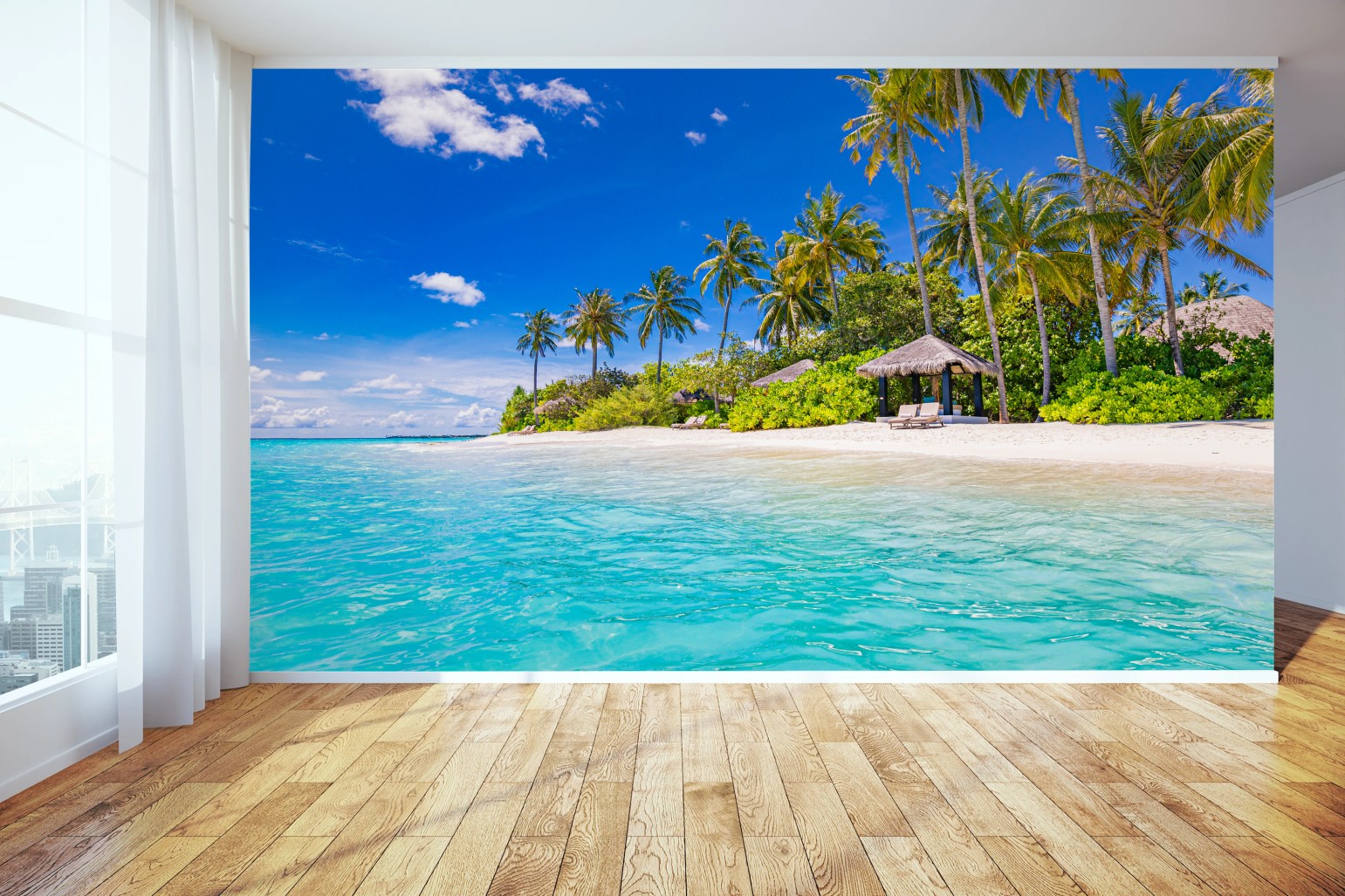 - meer, ozean, türkisblaues wasser, sommer, urlaub, paradies, palmen, sand, tropischer strand, bungalow