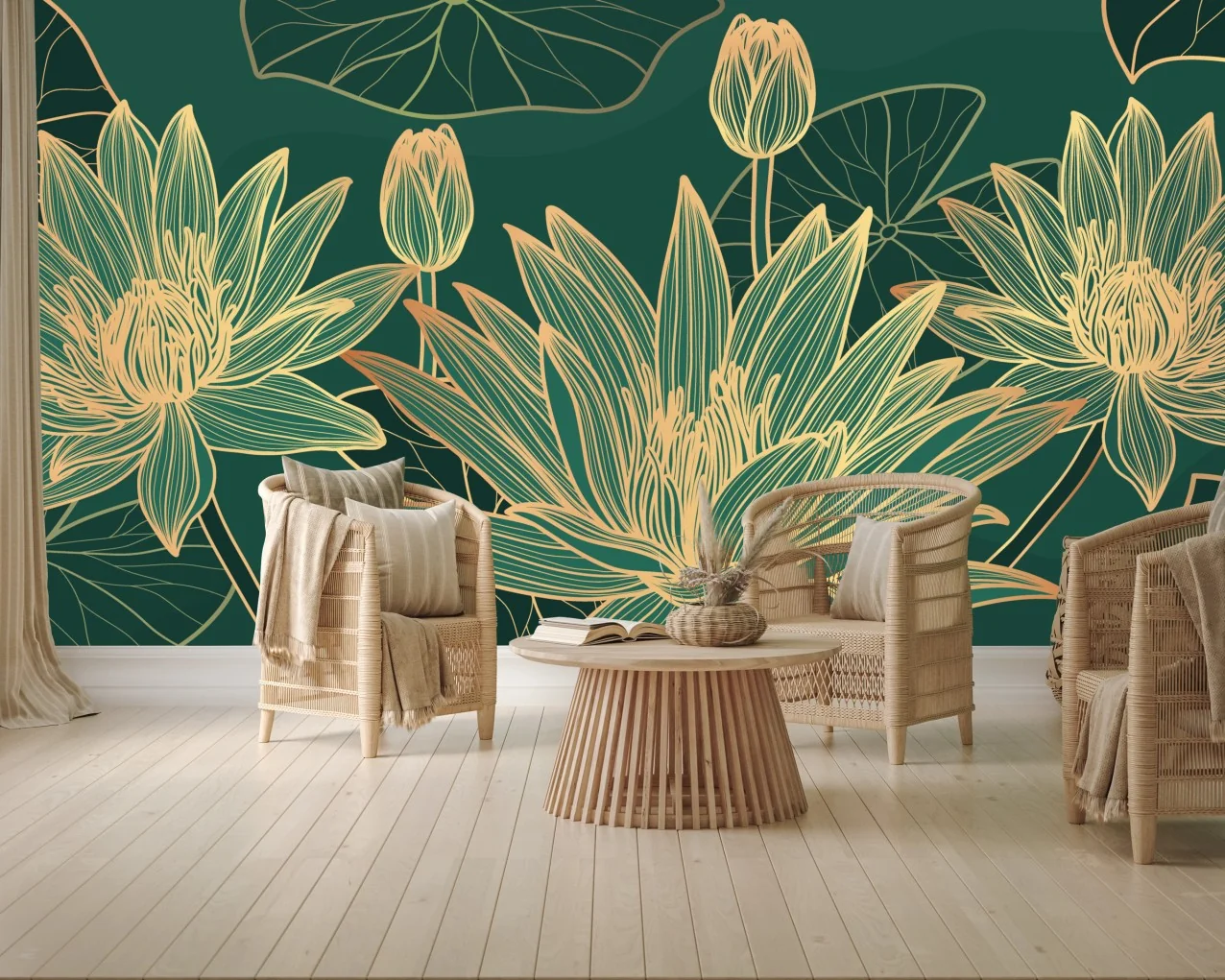 Fototapete Goldene lotosblüten auf grünem hintergrund