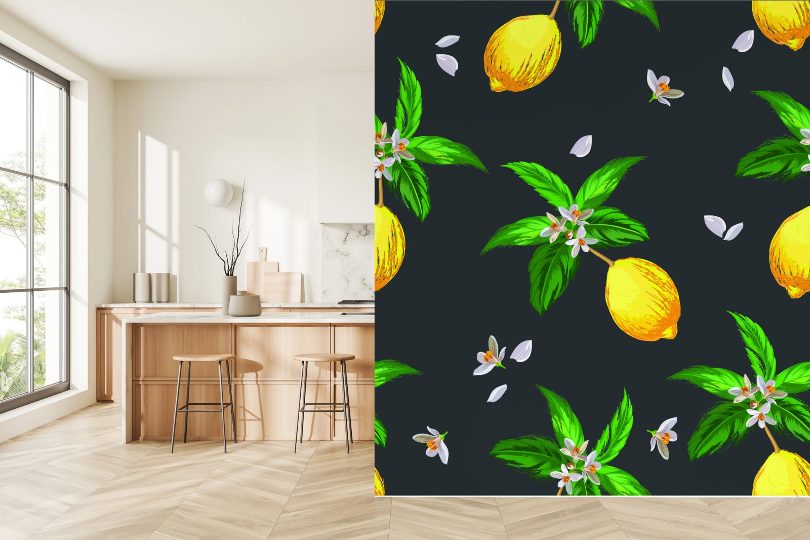 Fototapete Leuchtendes zitronenmuster mit grünen blättern