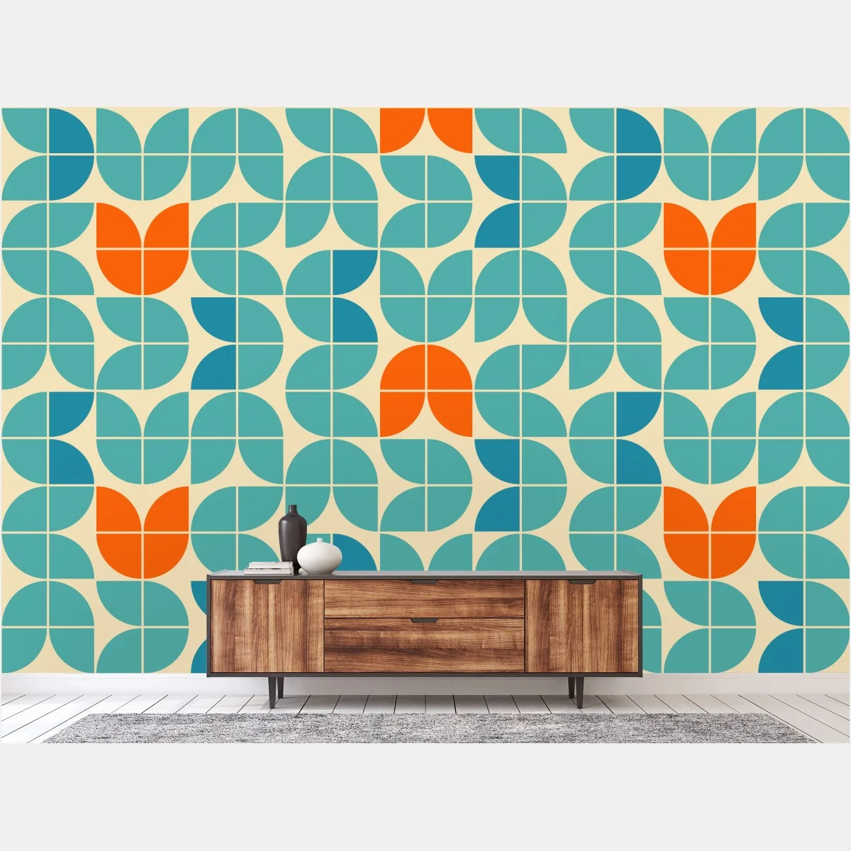 - türkis, abstrakt, nahtloses muster, retro, orange, mid-century, dekoration, geometrisches muster, blumenmotiv, fliesen