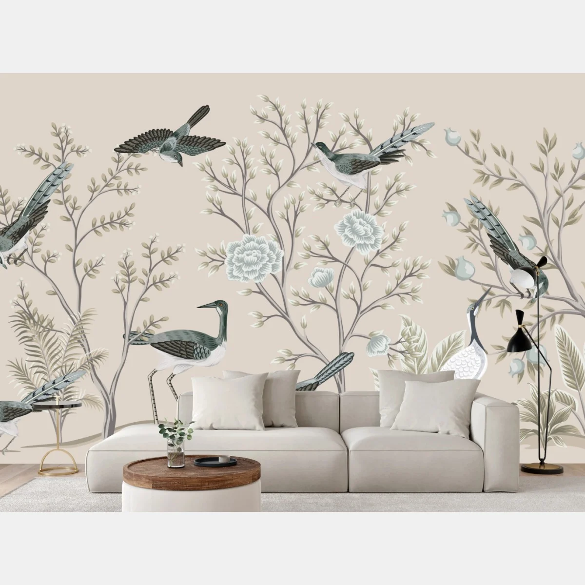 Bringen Sie ruhigen, vintage-inspirierten Charme mit filigranen Vögeln zwischen sanften Blüten auf einem neutralen Hintergrund.MehrWeniger