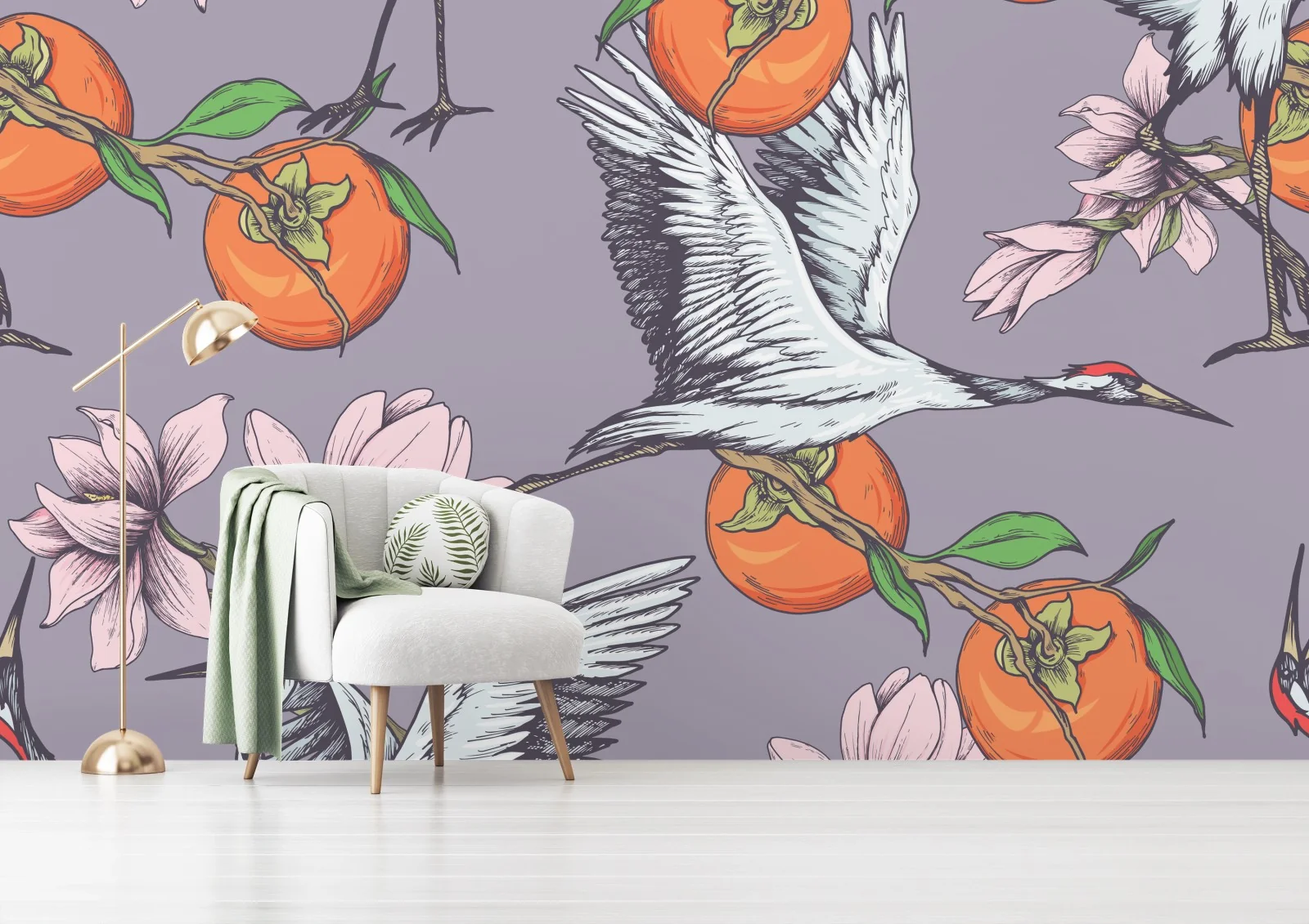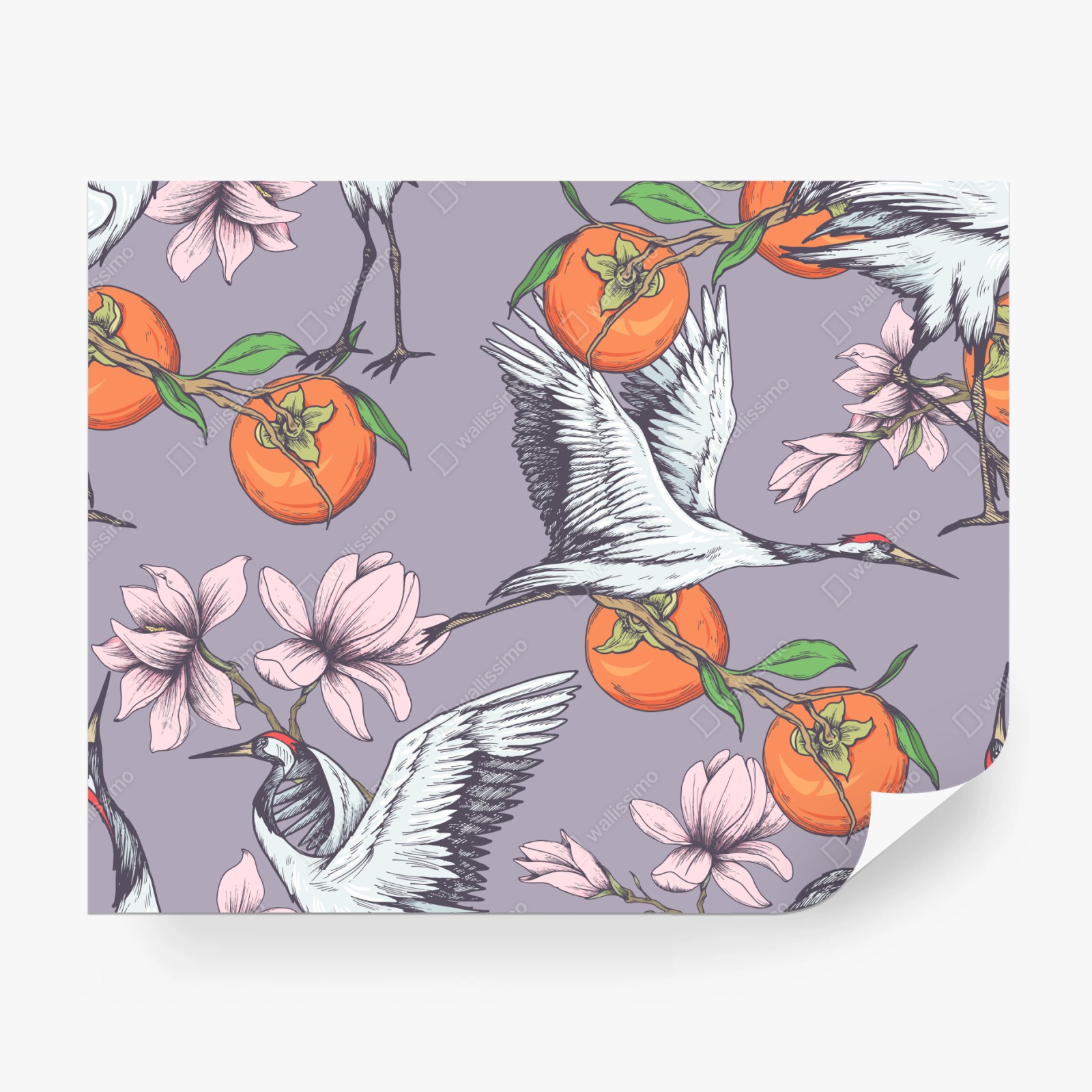 Fototapete Anmutige kraniche und kakis mit magnolien