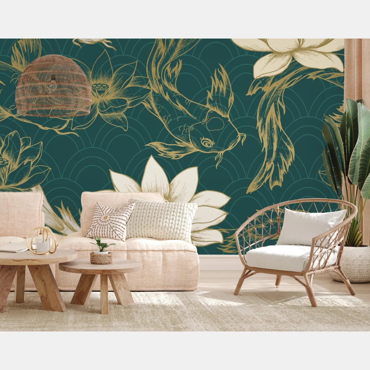 Fototapete Orientalisches koi- und lotosmuster in türkis und gold