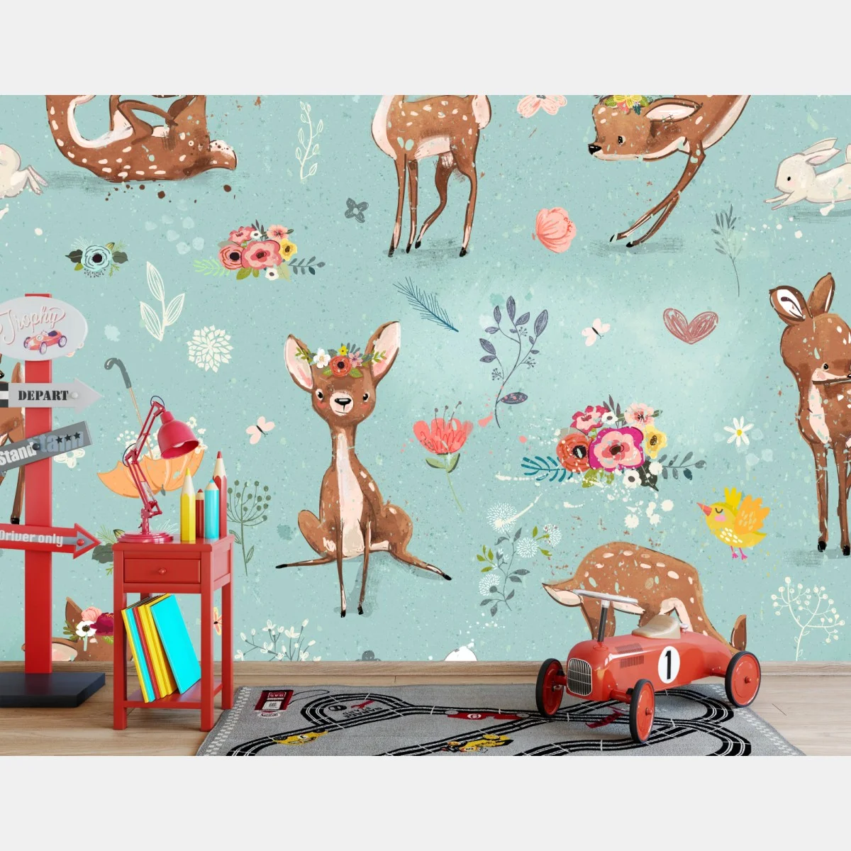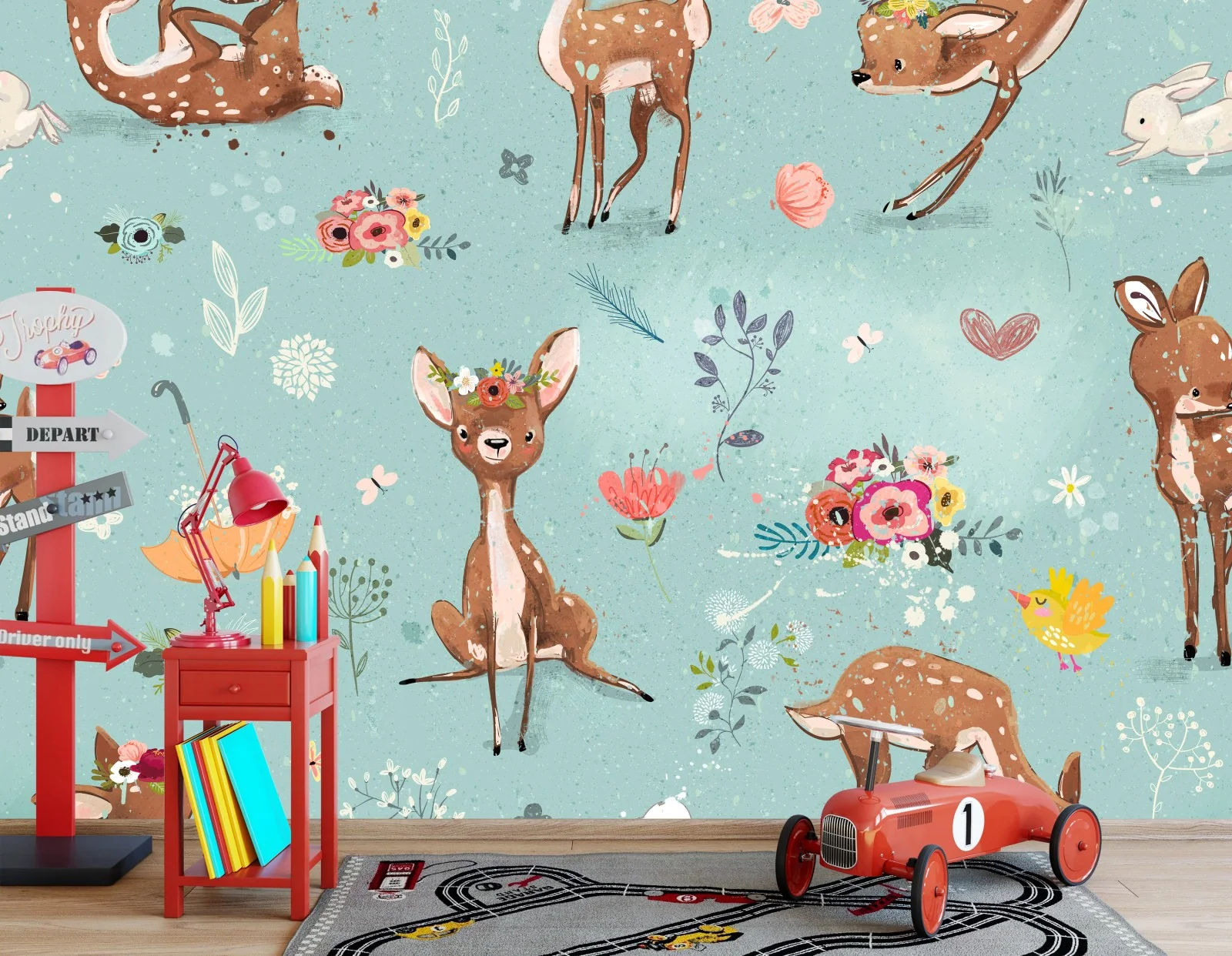 Fototapete Pastellmuster mit rehkitzen und hasen