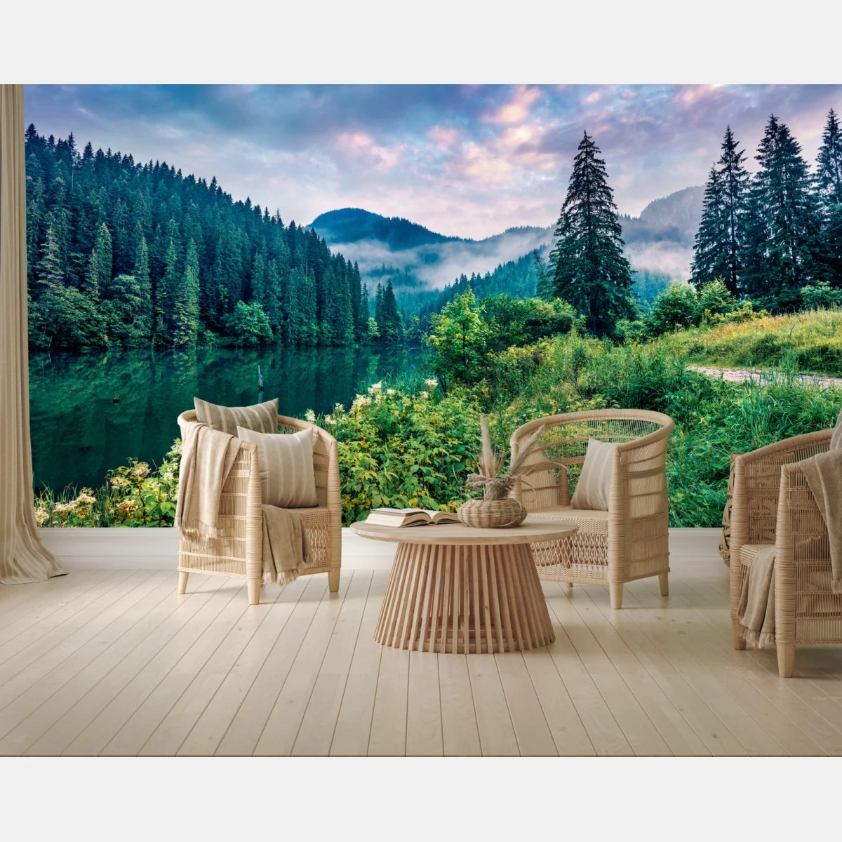 Fototapete Nebliger sonnenaufgang über Lacu Rosu