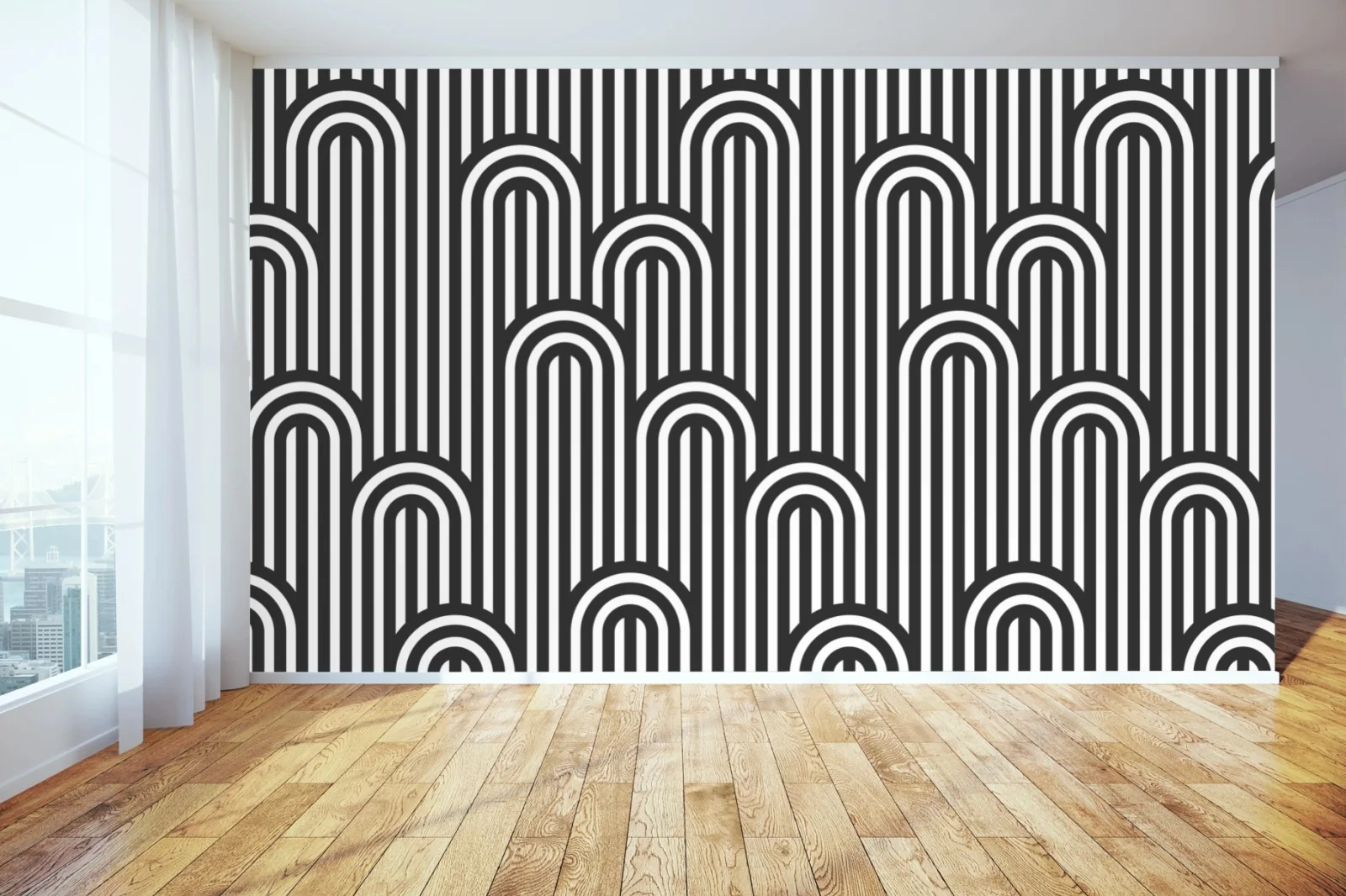- minimalistisch, modern, muster, nahtlos, geometrisch, wanddekoration, retro, schwarzweiß, streifen, optische täuschung
