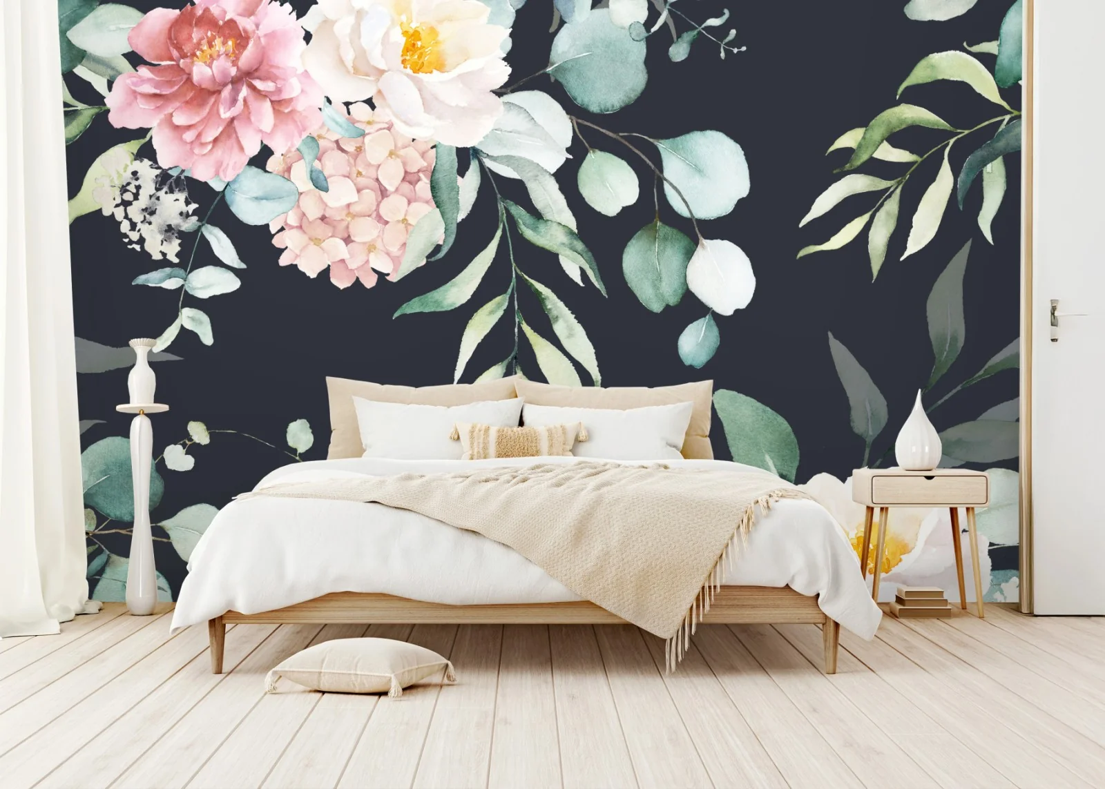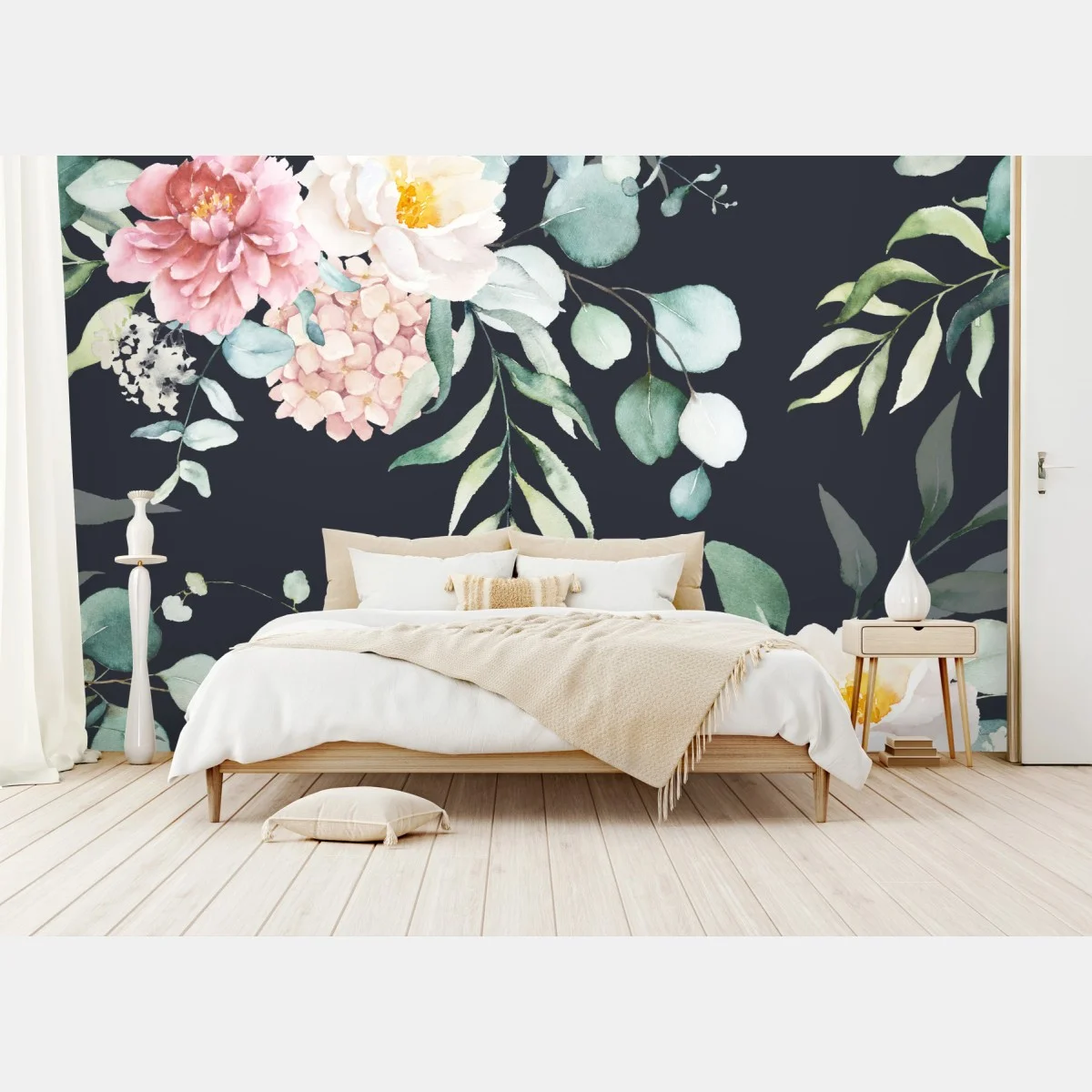 Fototapete Elegantes aquarell-blumenmuster auf dunklem hintergrund