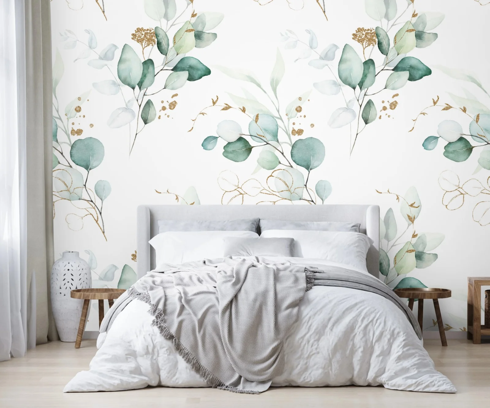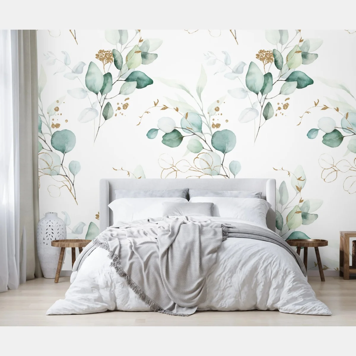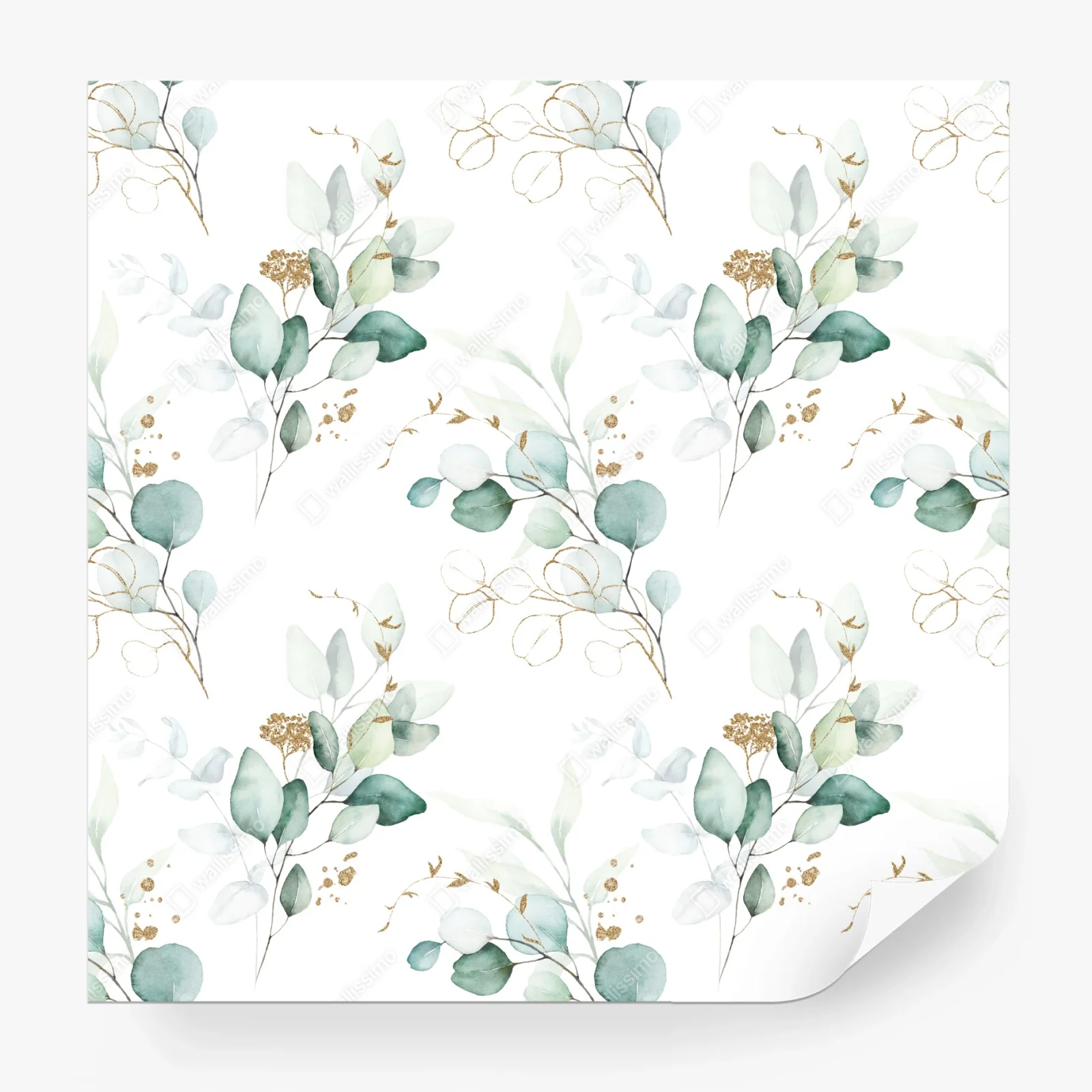 - minimalistisch, botanisch, grün, aquarell, blätter, muster, nahtlos, wanddeko, goldakzente, eukalyptus