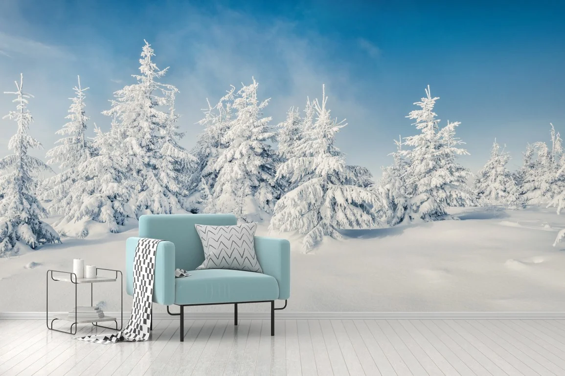- natur, panorama, landschaft, blauer himmel, wald, ruhig, schnee, winter, tannen, verschneit