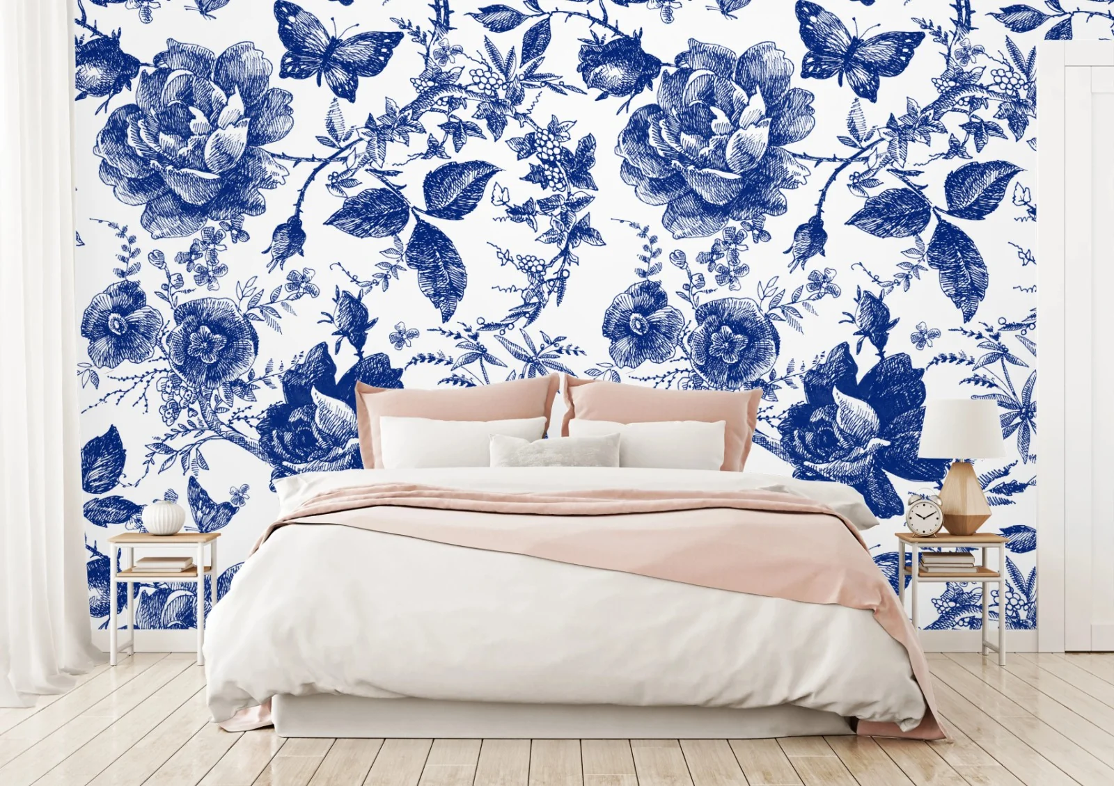 Verleihen Sie Ihrem Raum zeitlosen Charme mit diesem zarten blauen Blumen-toile-Muster, das vintage Eleganz und dezenten Kontrast in jedes Zimmer bringt.MehrWeniger