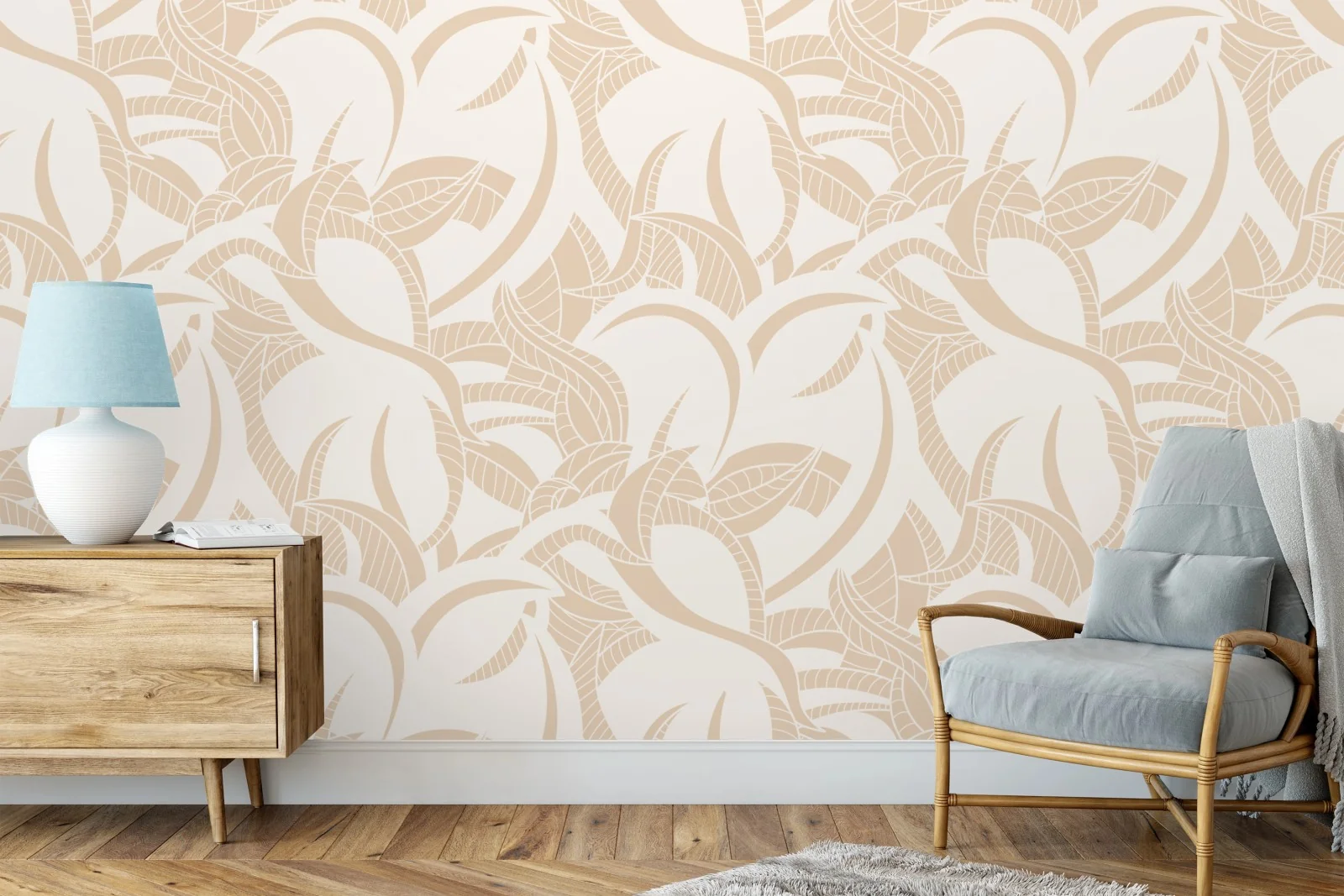 Bringen Sie ruhige, natürliche Eleganz an die Wände mit diesem beigen botanischen Blattmuster, ideal für moderne und skandinavische Einrichtungen.MehrWeniger