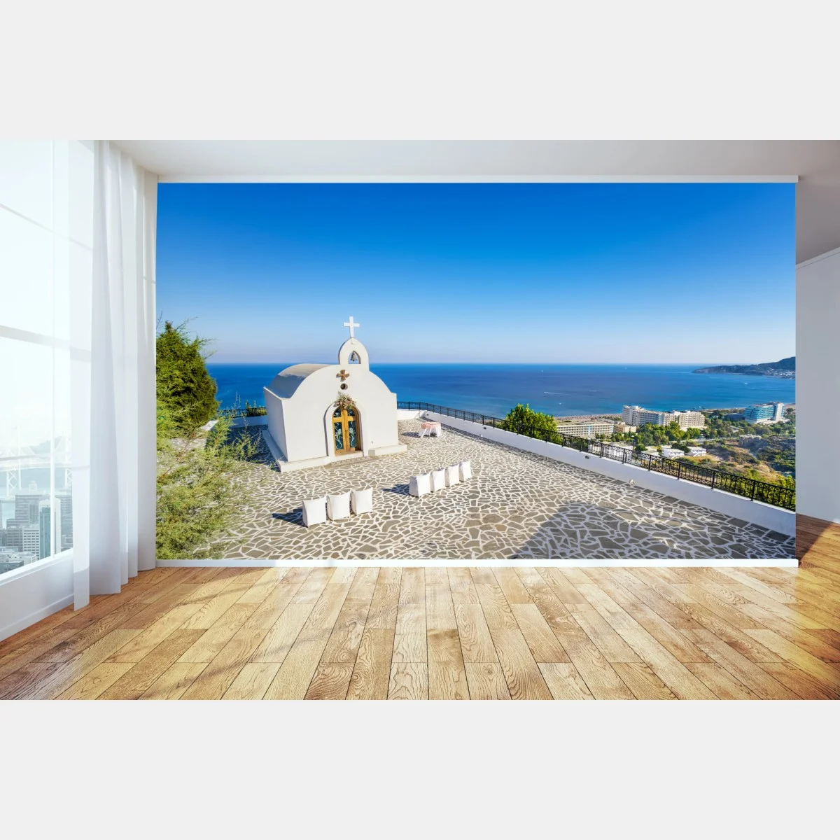 Fototapete Weiße kapelle mit meerblick in Faliraki