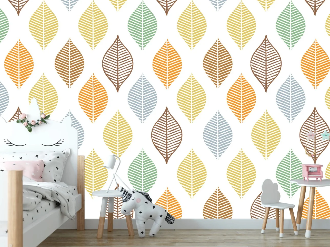 - kinderzimmer, modern, botanisch, natur, pastell, blätter, tapete, wanddekoration, skandinavisch, blattmuster