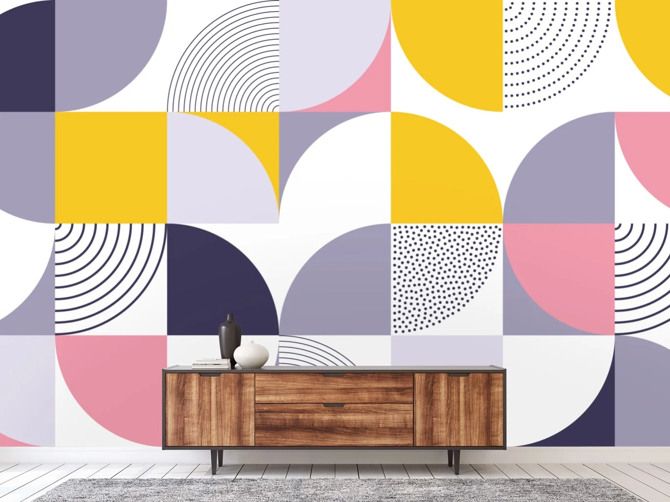 - wanddekoration, pastellfarben, minimalistische kunst, geometrisches muster, abstrakte kunst, halbkreise, moderner einrichtungsstil, graphikdesign, farbiges motiv, retro inspiriert