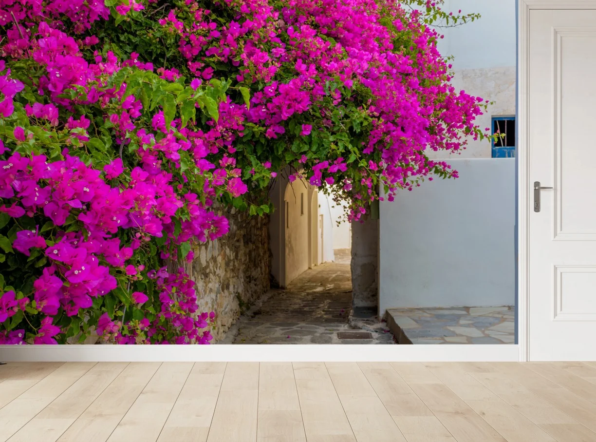 - sommer, bougainvillea, mediterran, weiß getünchte häuser, naousa, paros, griechische gasse, kykladische architektur, blaue fensterläden, gepflasterter weg