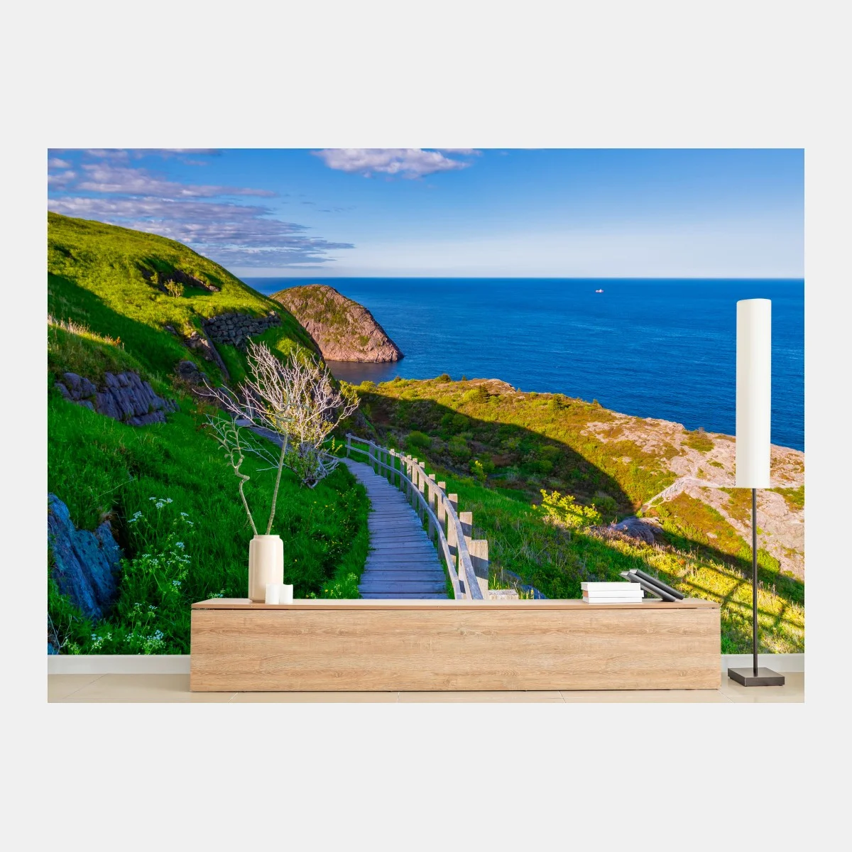 Bringen Sie ruhige Küstenlandschaft in Ihr Zuhause mit diesem lebendigen Motiv eines Holzstegs, grüner Klippen und tiefblauem Meer unter leicht bewölktem Himmel.MehrWeniger