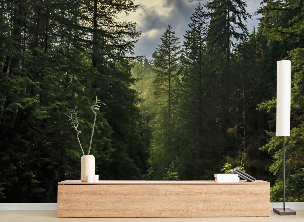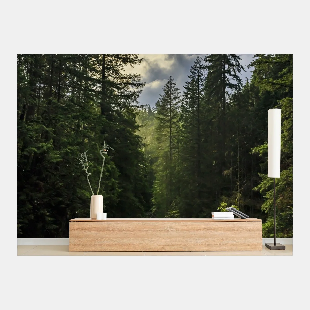 Fototapete Nebliger immergrüner wald mit wasserfall