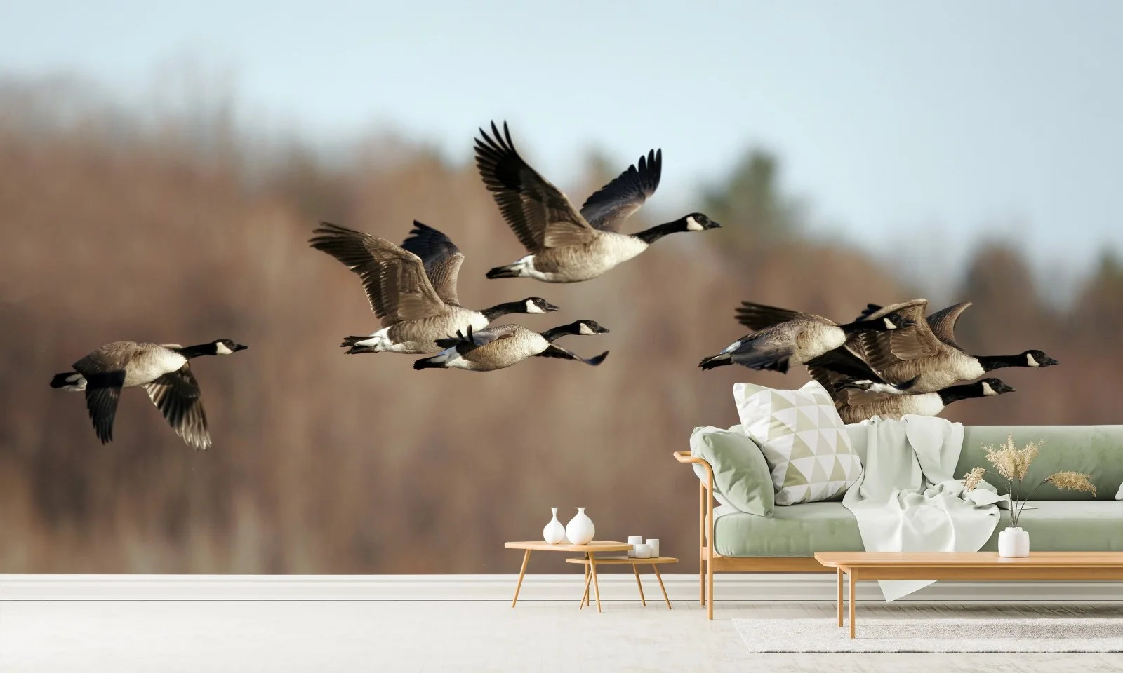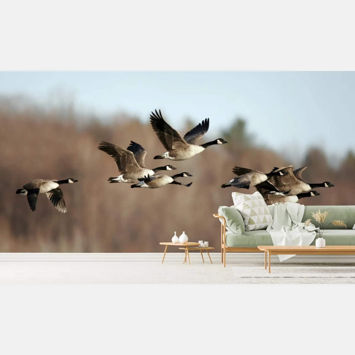 Fototapete Gänse im flug über herbstliches feuchtgebiet