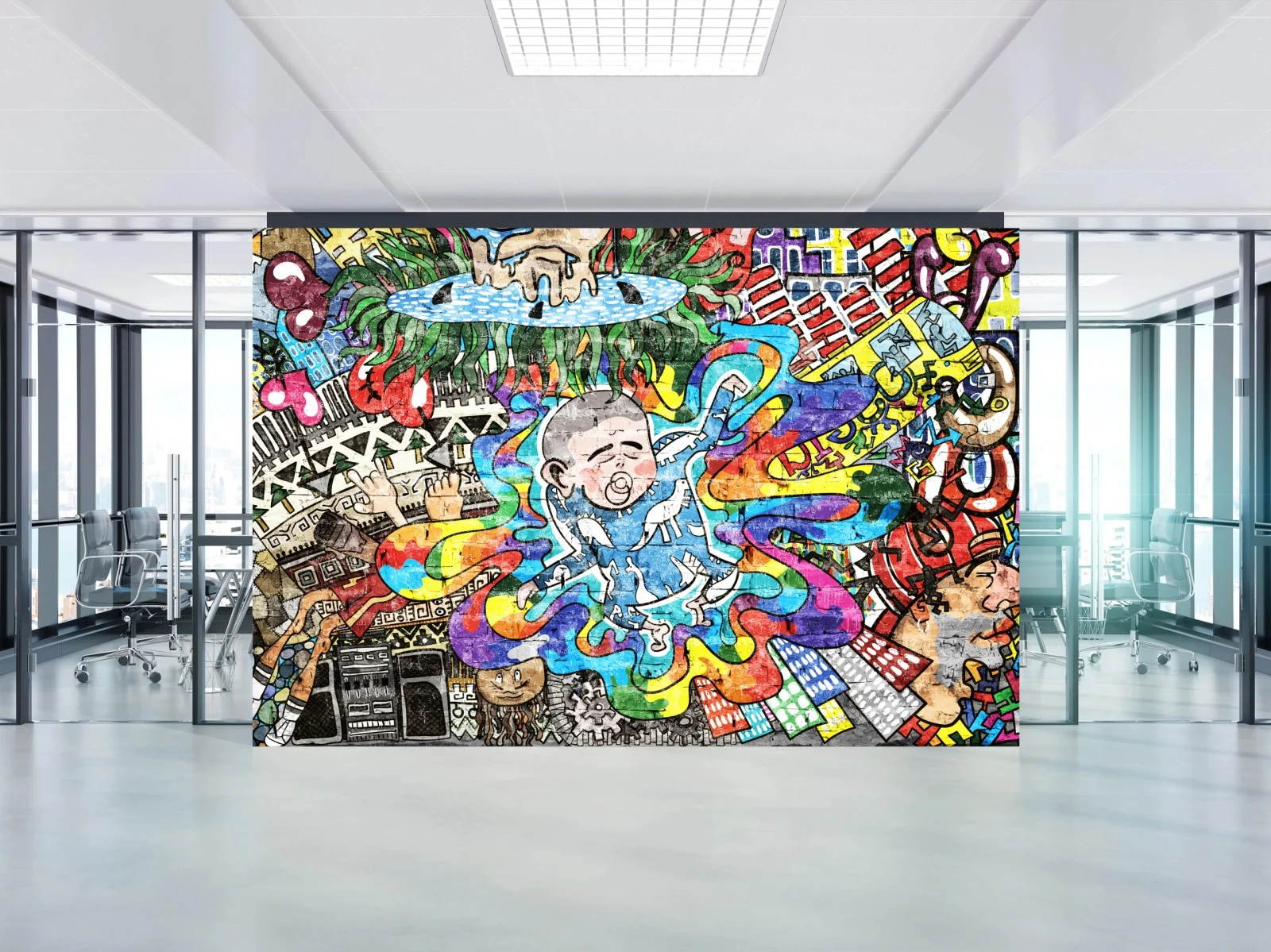 Fototapete Buntes graffiti-mural mit träumendem kind