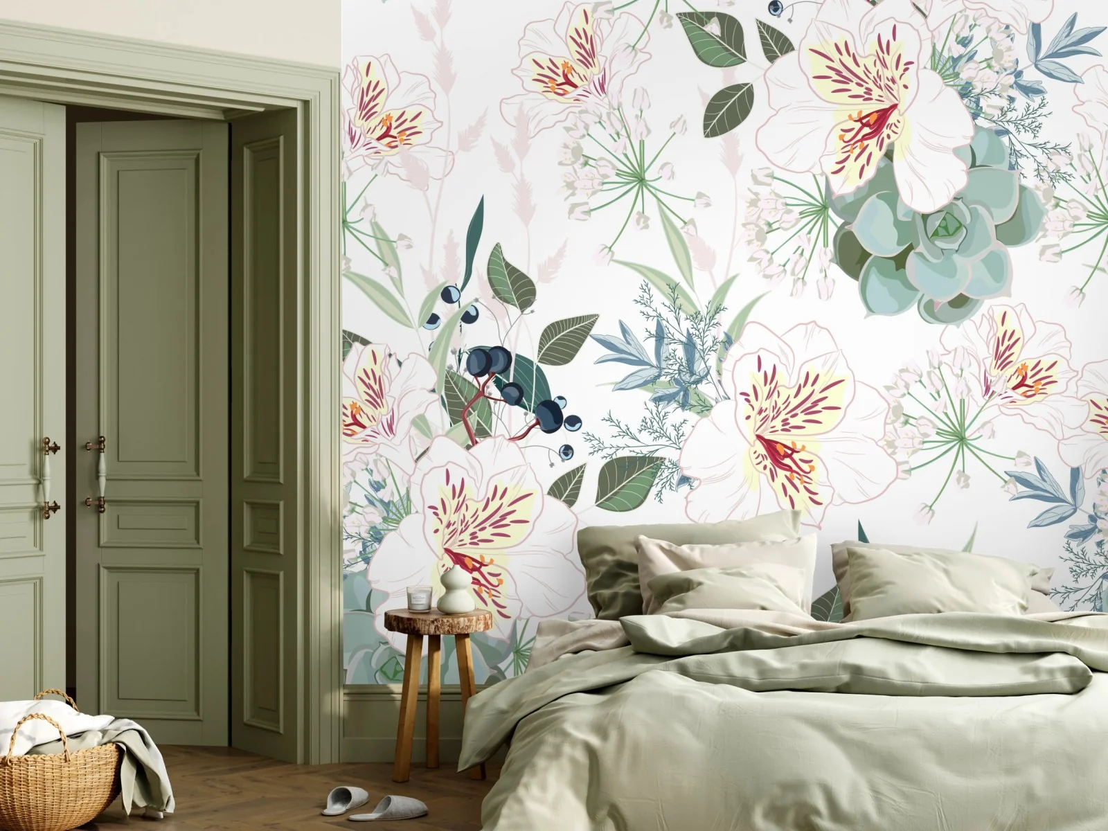 zarte pastellblumen und sukkulenten schaffen ein ruhiges botanisches muster, das jedem raum eleganz und gelassenheit verleiht.MehrWeniger