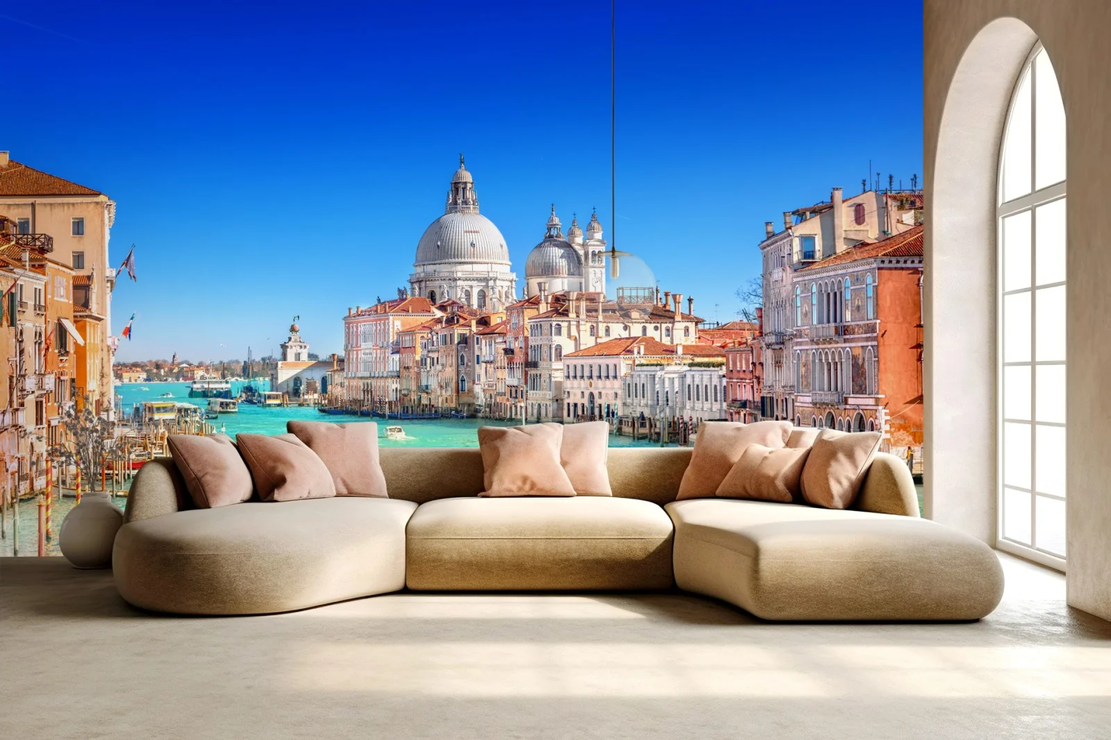 Helle Panoramaansicht des Canal Grande und der Basilika Santa Maria della Salute bringt mediterranen Charme und historische Architektur in jeden Raum.MehrWeniger
