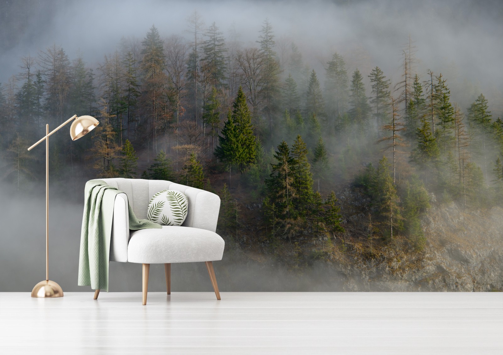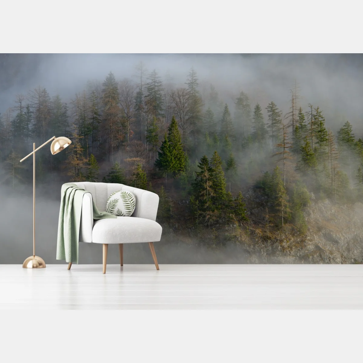 Nebliger Bergwald, der Ruhe und natürliche Atmosphäre in jeden Raum bringt.MehrWeniger