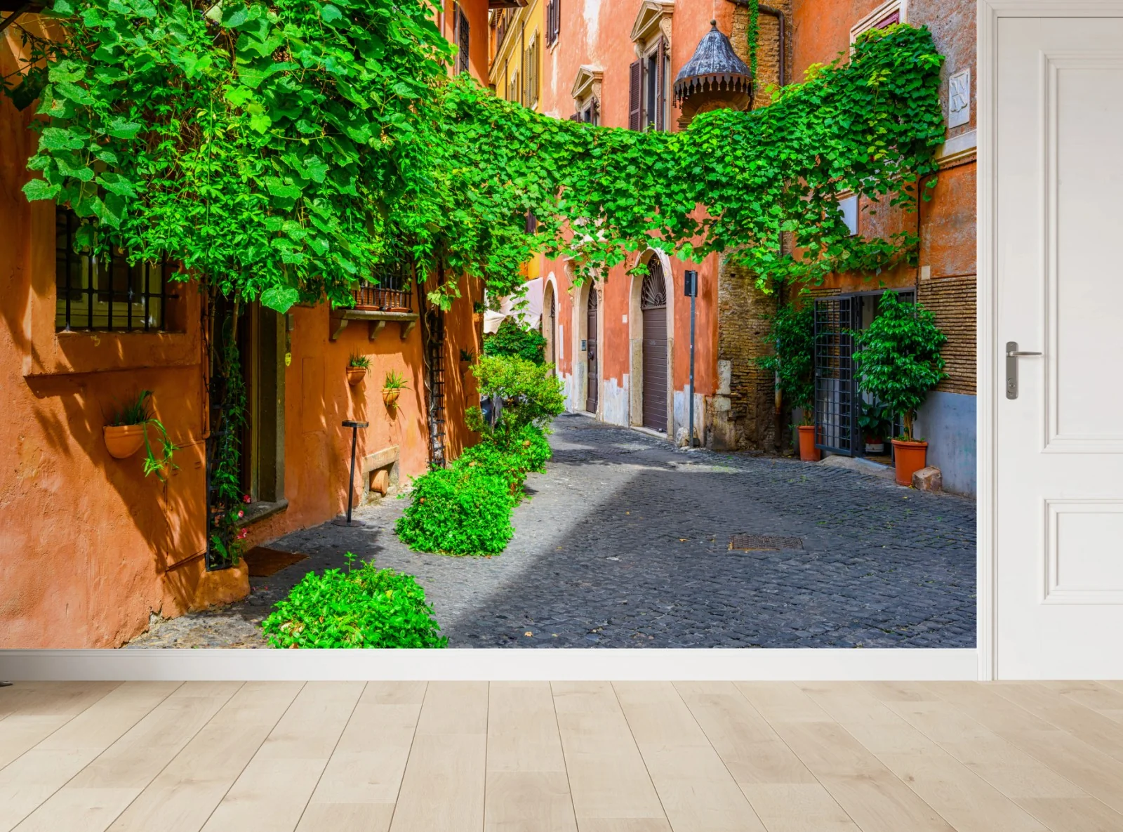 - altstadt, architektur, mediterran, kopfsteinpflaster, gasse, italien, trastevere, rom, kletterpflanzen, orange fassaden
