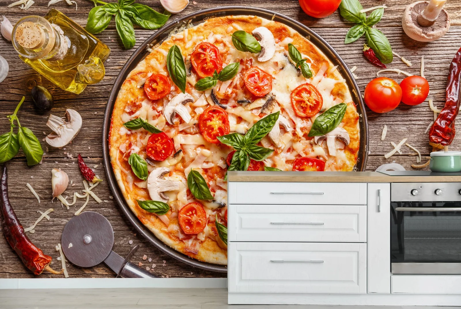 Fototapete Frische pizza mit basilikum und cherrytomaten
