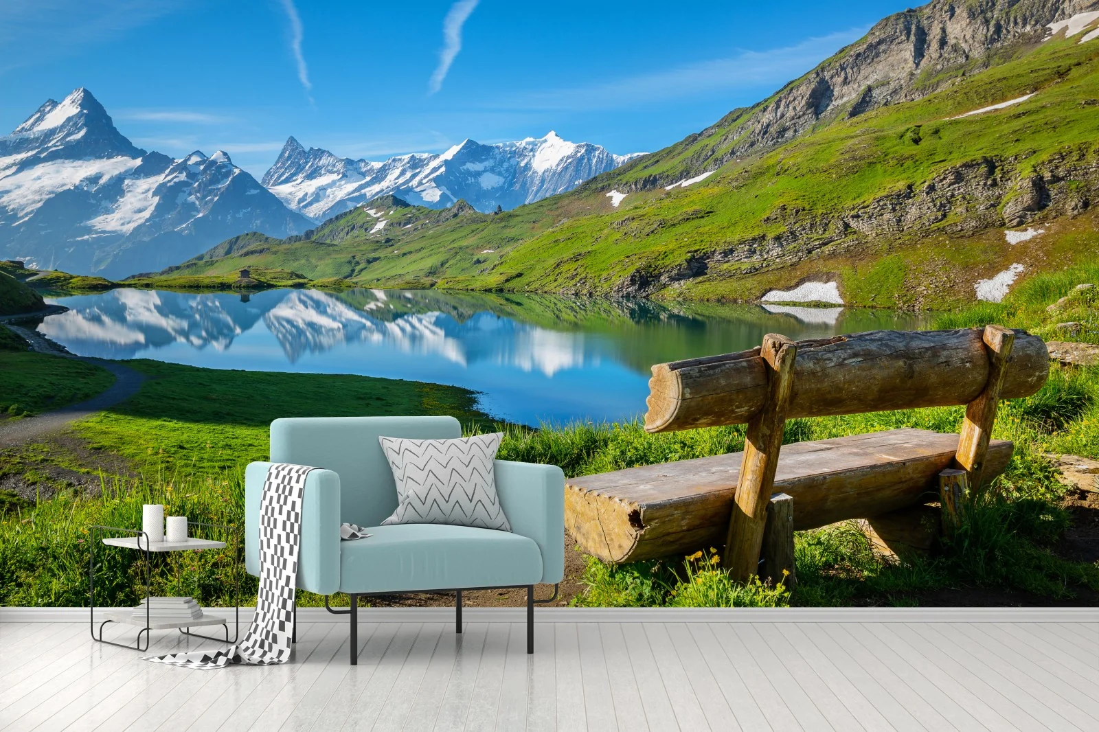 Eine friedliche Alpenlandschaft mit einer hölzernen Bank an einem spiegelnden Bergsee, ideal, um Ruhe in jeden Raum zu bringen.MehrWeniger