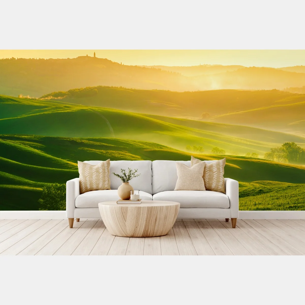 Fototapete Goldener sonnenaufgang über sanften grünen hügeln