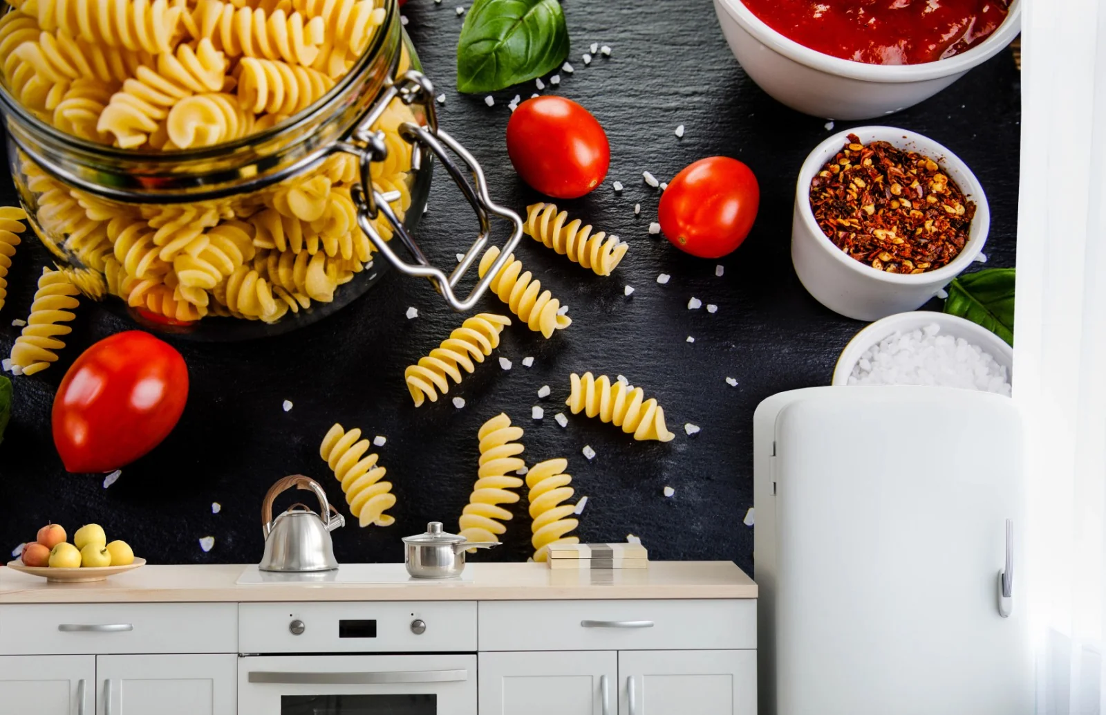 Fototapete Pasta zutaten arrangiert mit tomaten und basilikum