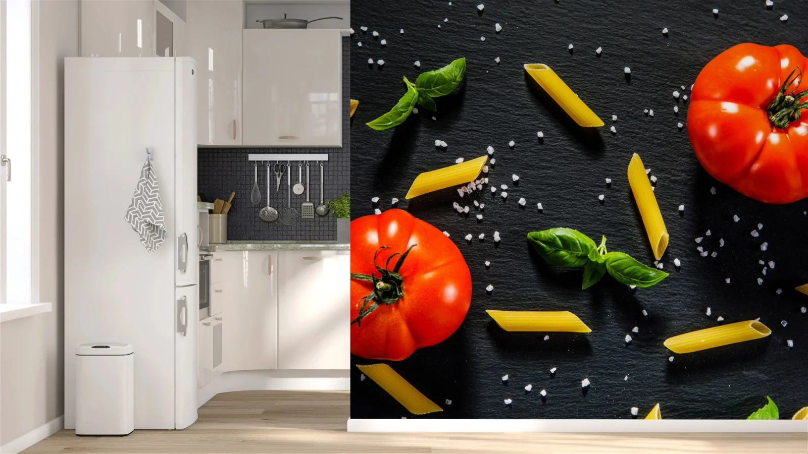 Fototapete Tomaten und penne auf schwarzem schiefer
